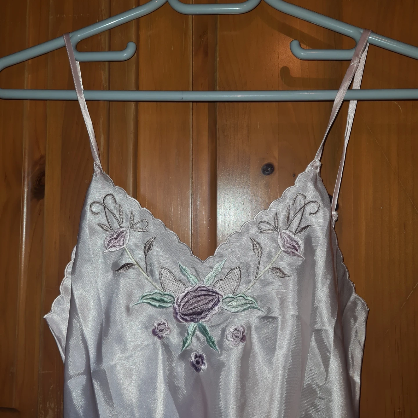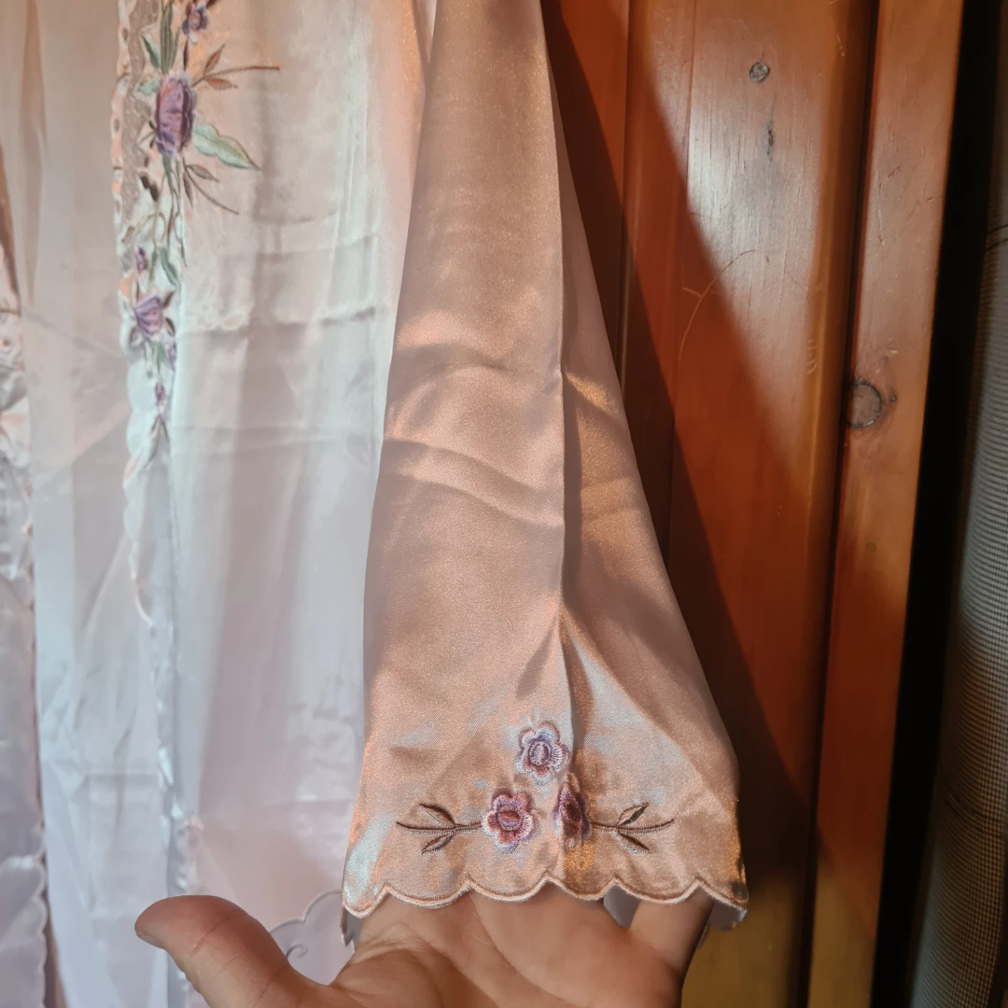 This is a two-piece satin-like sleepwear set featuring a camisole and a matching robe. It's adorned with delicate floral embroidery on the neckline of the camisole and the lapels of the robe. The fabric has a lovely sheen and is lightweight. The robe includes pockets. A ruban belt is included.