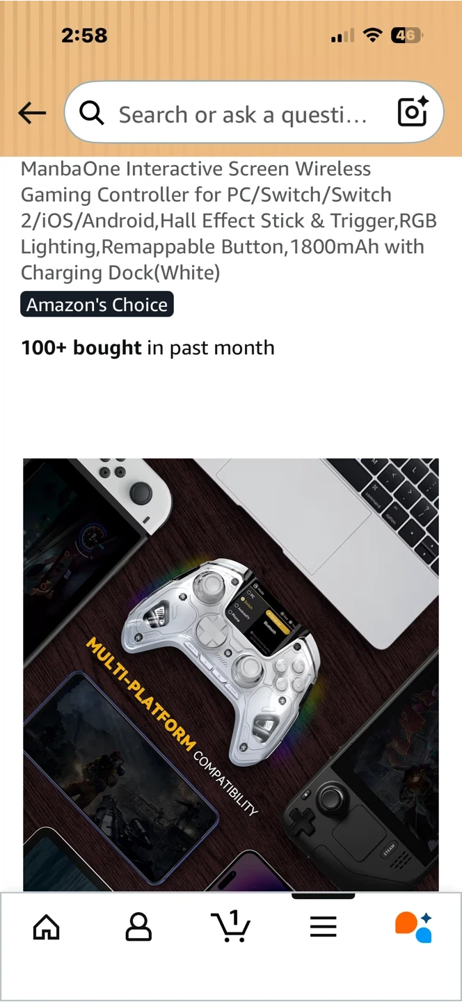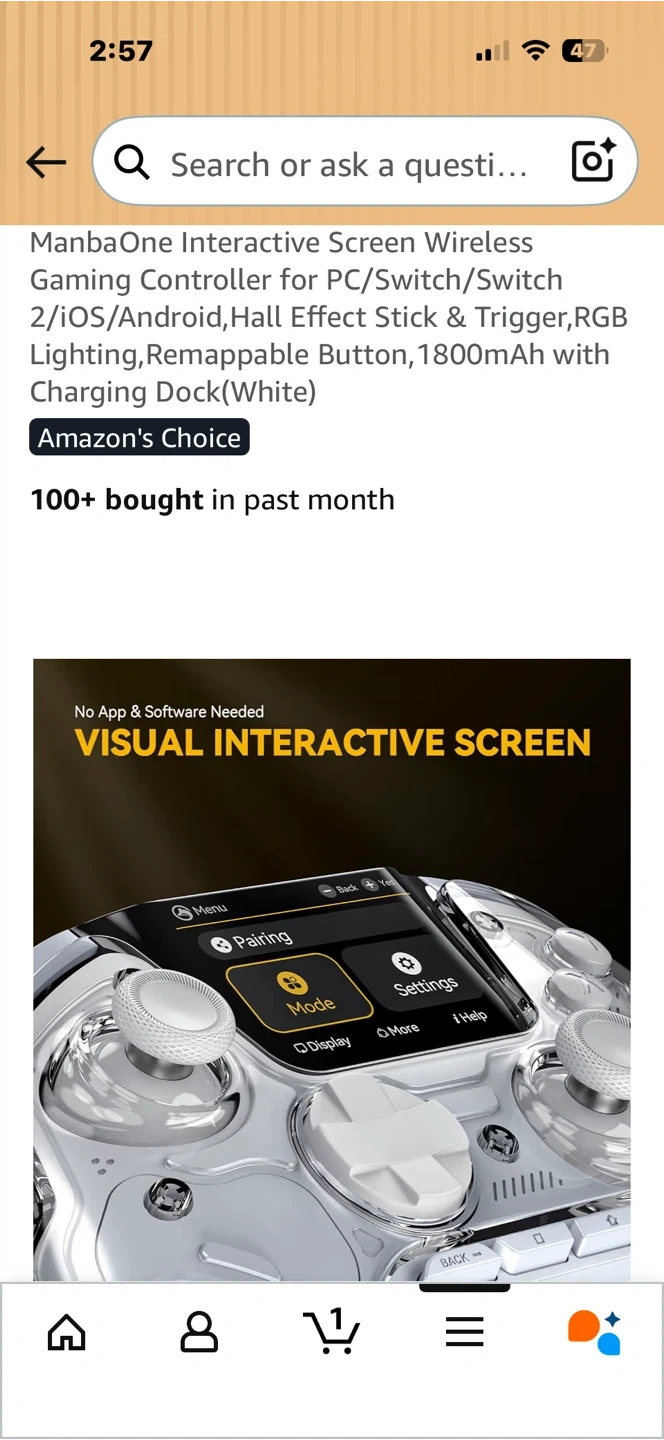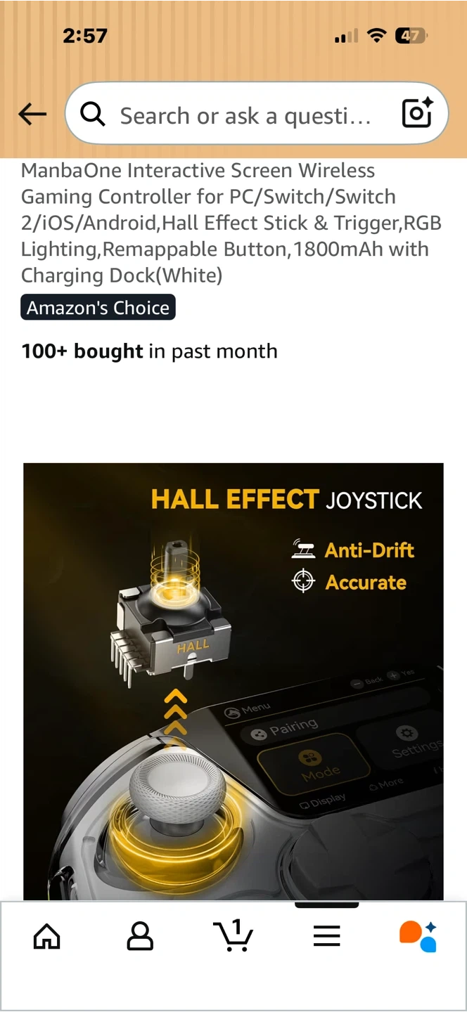 ManbaOne interactive screen wireless gaming controller for PC, Switch, and mobile devices. It features RGB lighting and a 1800mAh battery with a charging dock. This controller has Hall effect sticks and triggers for enhanced accuracy. It's compatible with PC, Switch, 2/iOS, and Android.