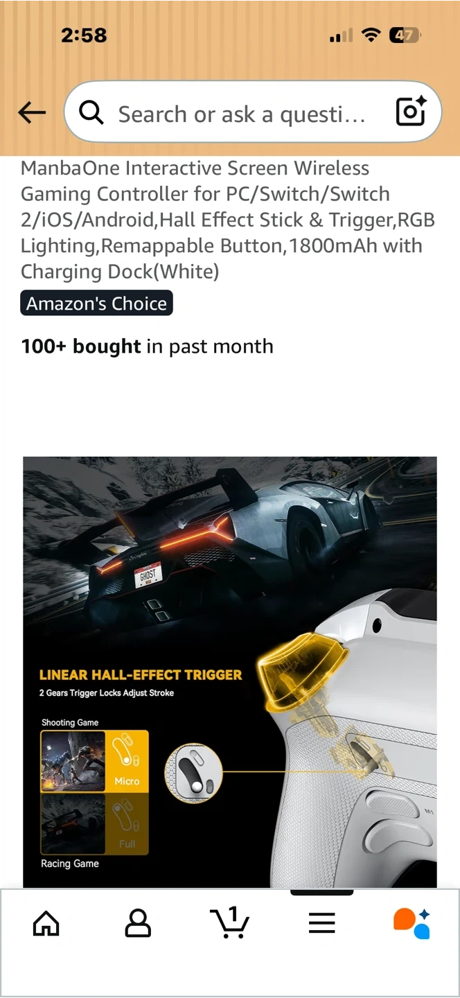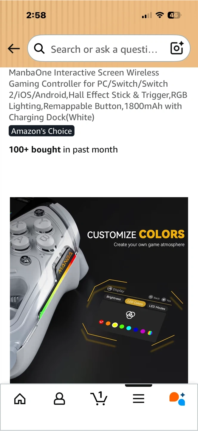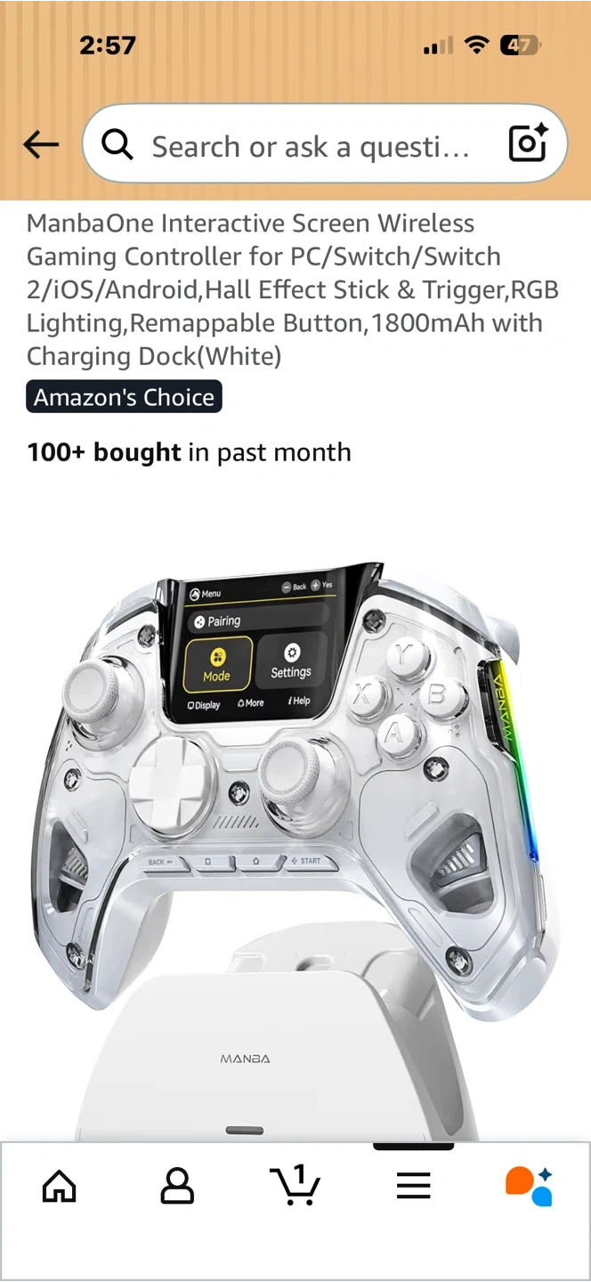 ManbaOne interactive screen wireless gaming controller for PC, Switch, and mobile devices. It features RGB lighting and a 1800mAh battery with a charging dock. This controller has Hall effect sticks and triggers for enhanced accuracy. It's compatible with PC, Switch, 2/iOS, and Android.