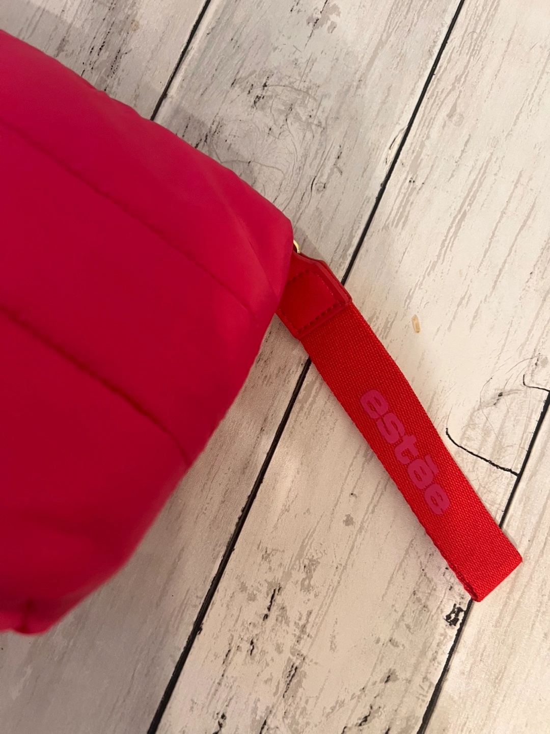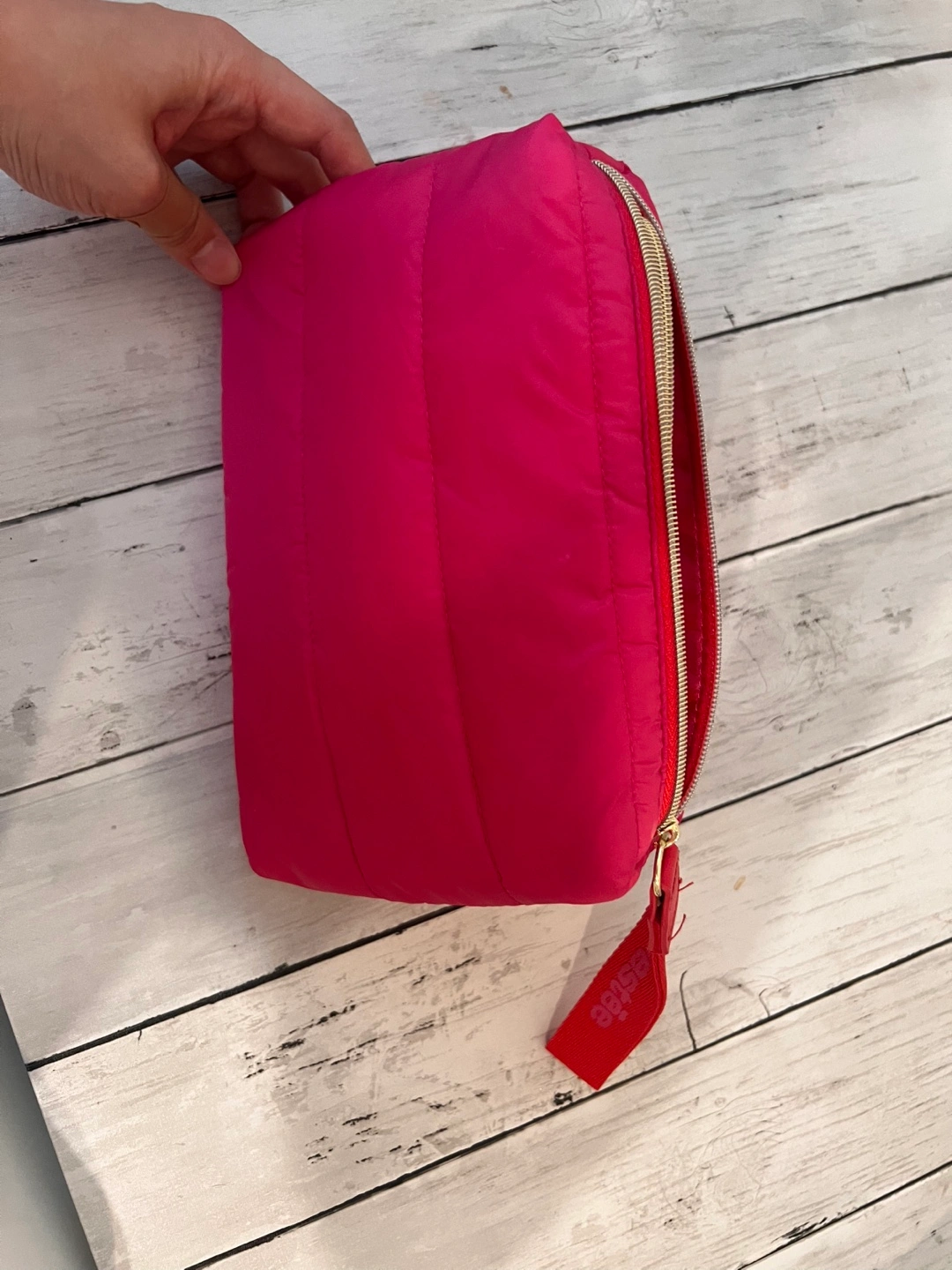 This pink puffer cosmetic bag is super cute and spacious.