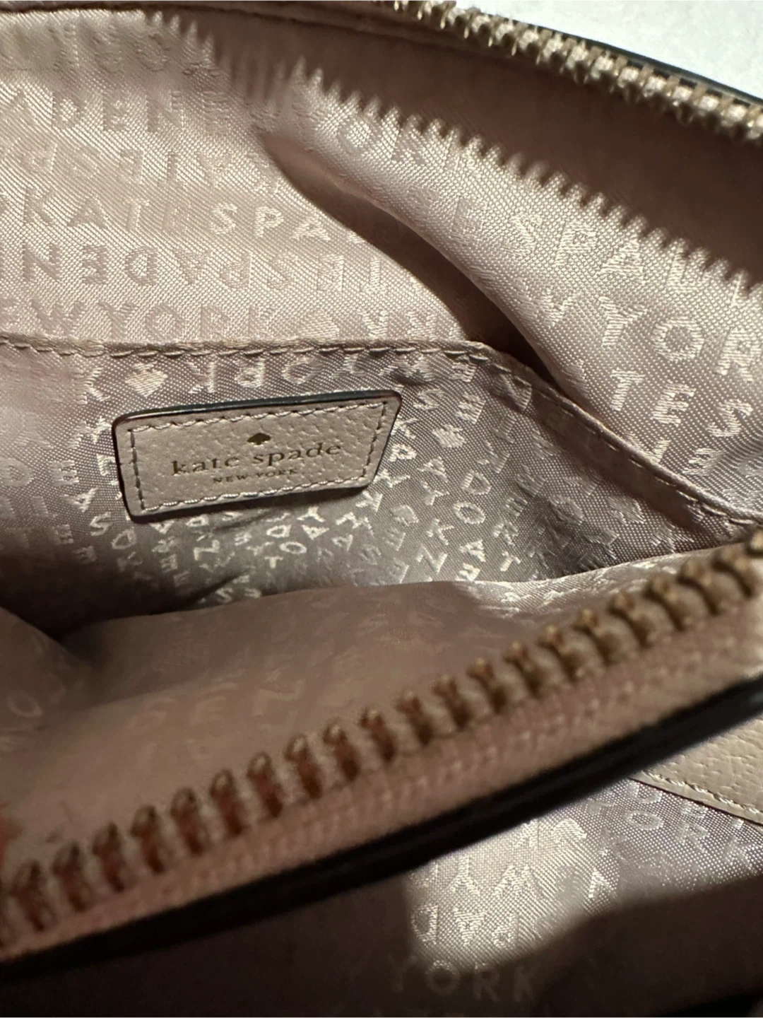 A classic Kate Spade crossbody bag in a lovely nude. It's made from genuine leather and features a secure zip closure. The interior is lined with branded fabric and has a small patch pocket. This bag's simple design makes it a versatile accessory for everyday use!