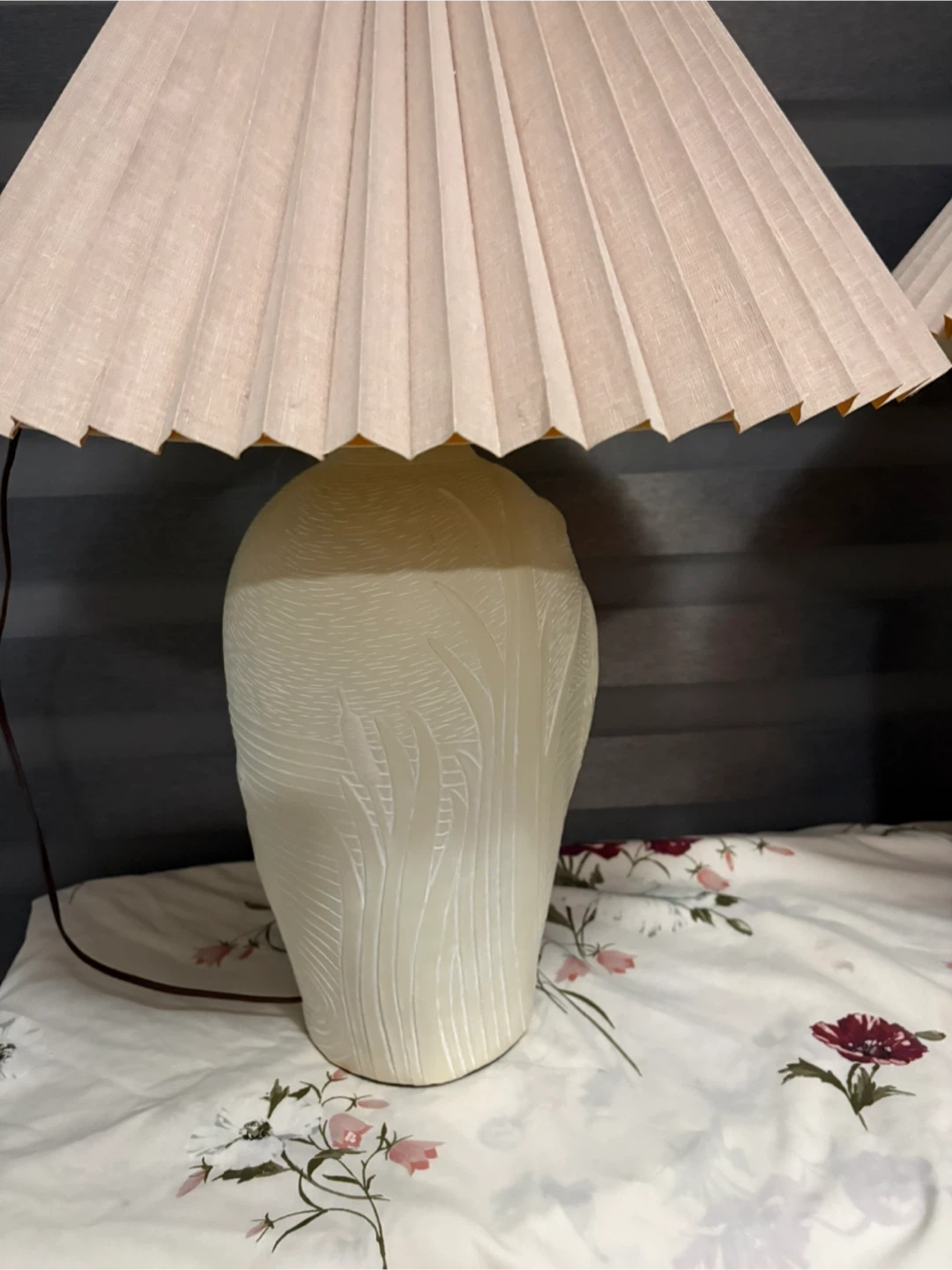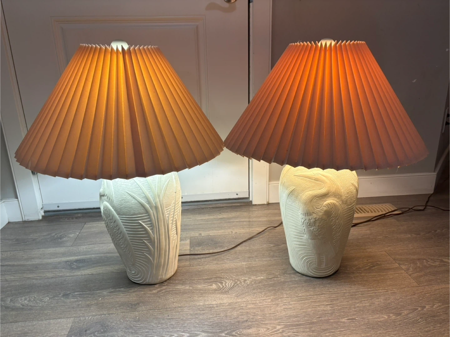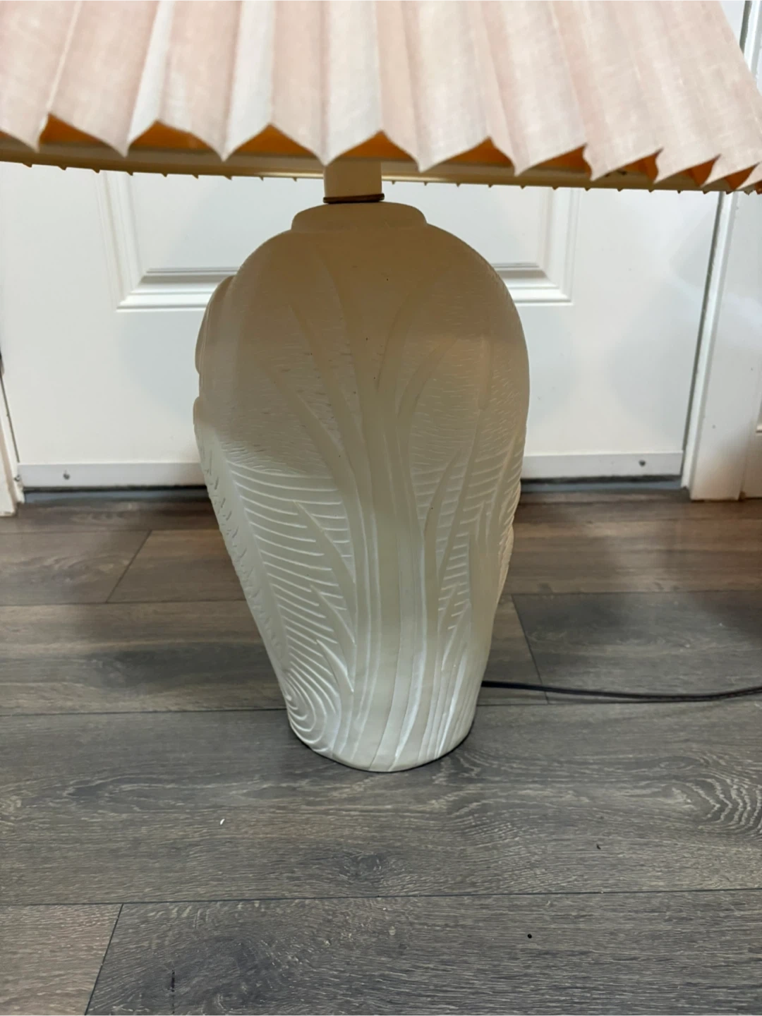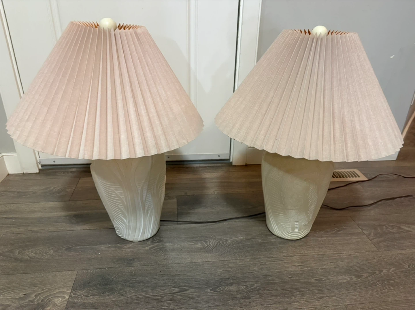 A pair of lovely cream-coloured ceramic table lamps, each featuring a unique carved design on the base. They come with coordinating pleated lampshades that cast a warm glow. These lamps are sure to add a touch of vintage charm to any room!