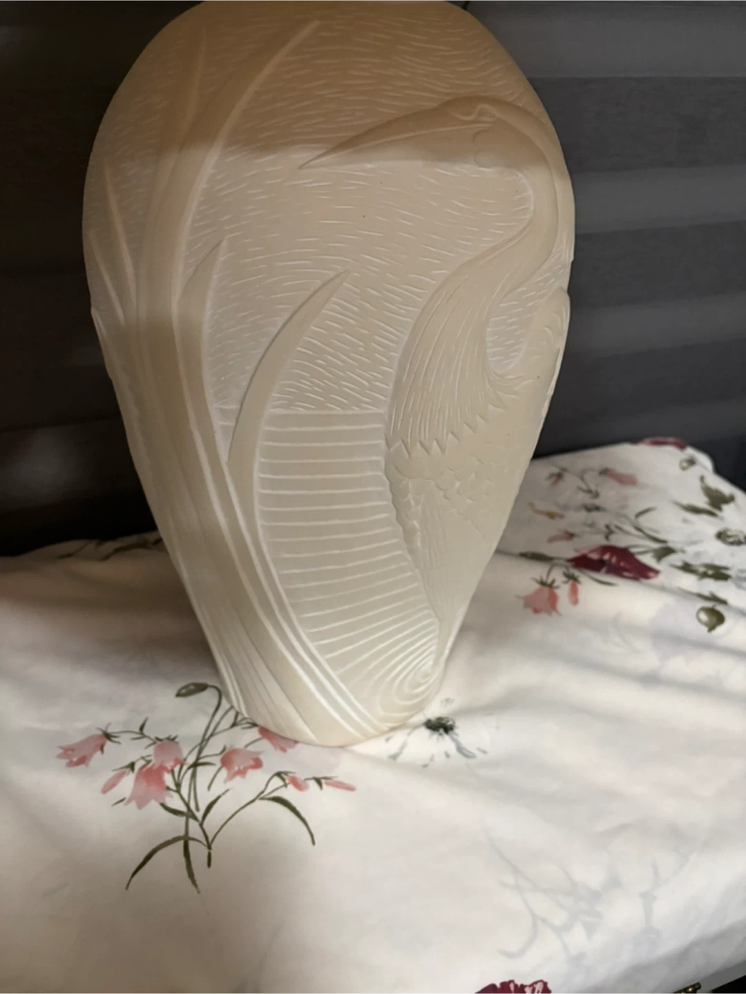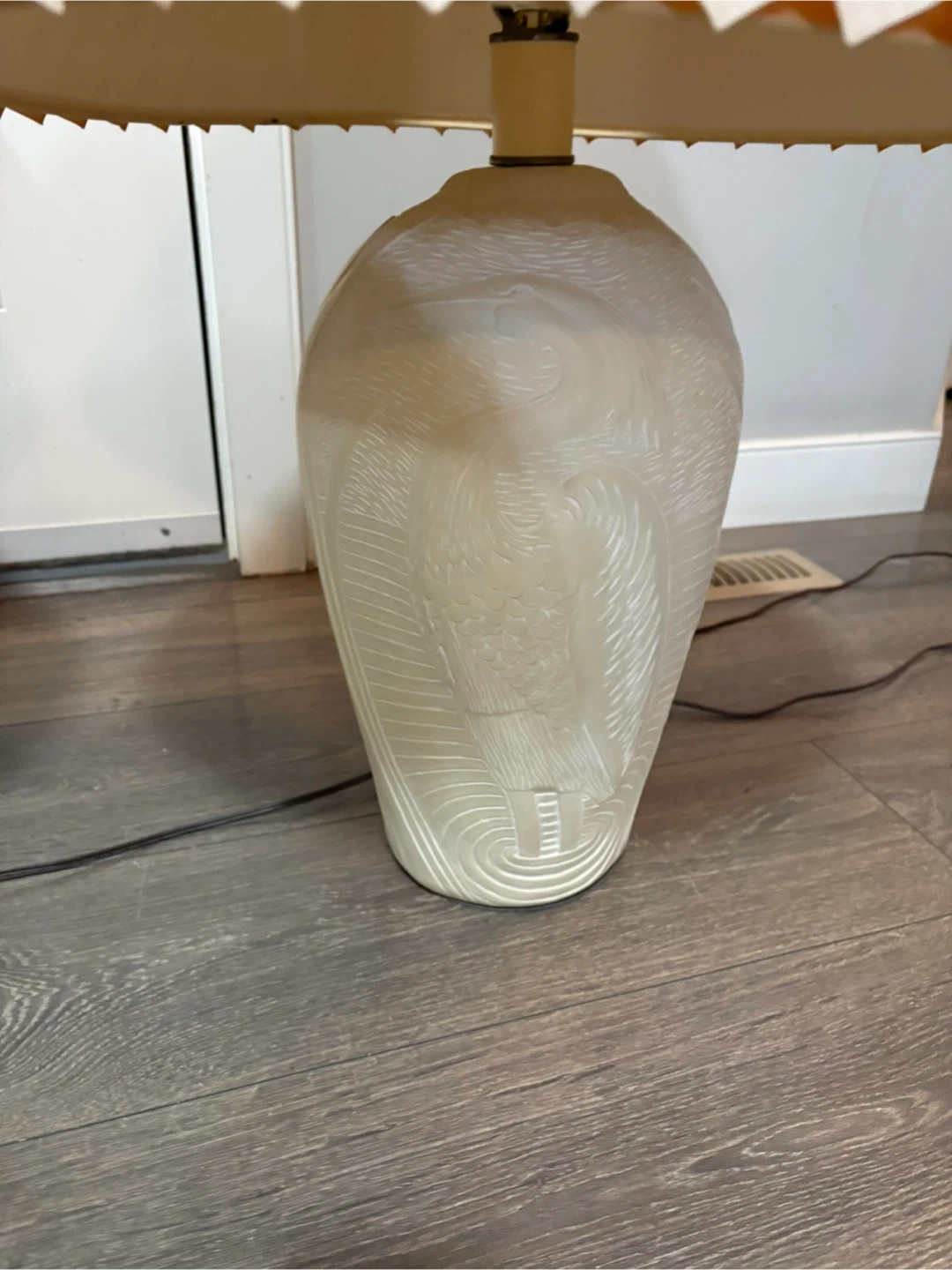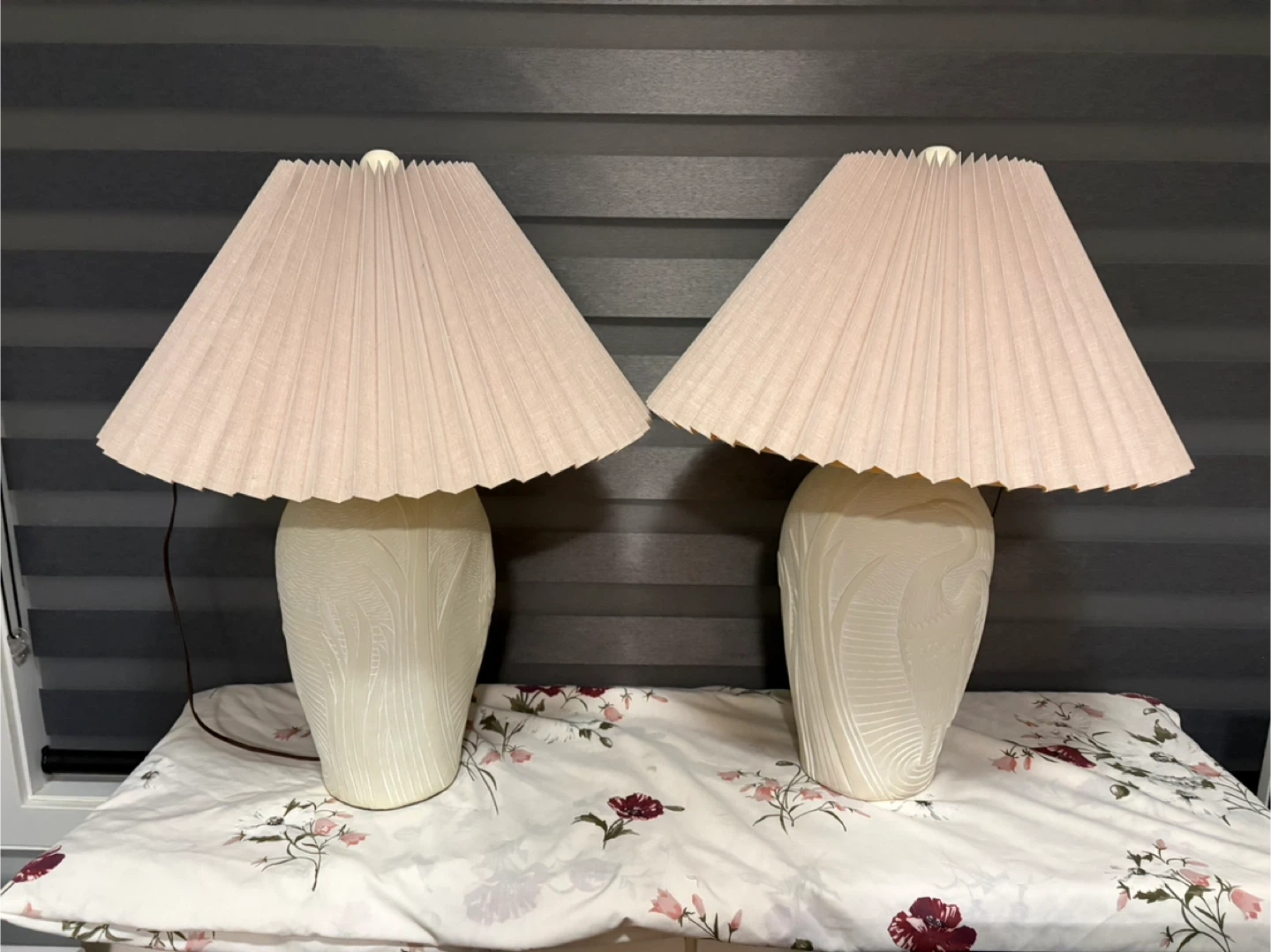 A pair of lovely cream-coloured ceramic table lamps, each featuring a unique carved design on the base. They come with coordinating pleated lampshades that cast a warm glow. These lamps are sure to add a touch of vintage charm to any room!