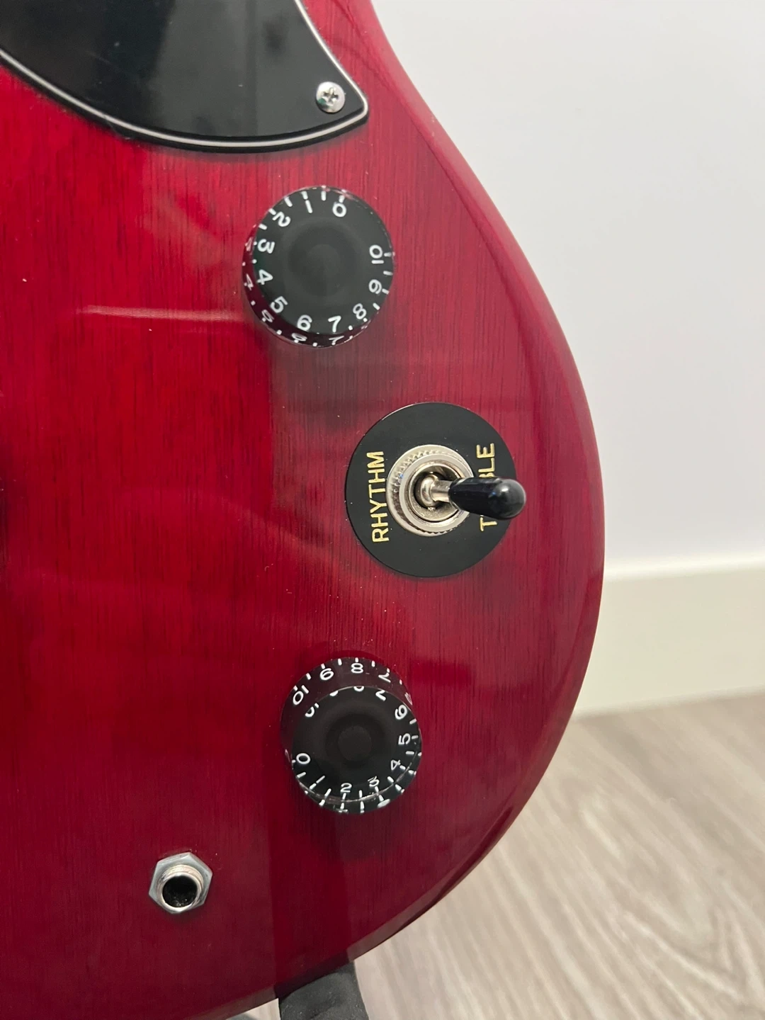 Epiphone Special SG electric guitar in cherry red. Features dual humbucker pickups and a toggle switch. Made in Indonesia. This guitar is great for learning or playing rock music!
