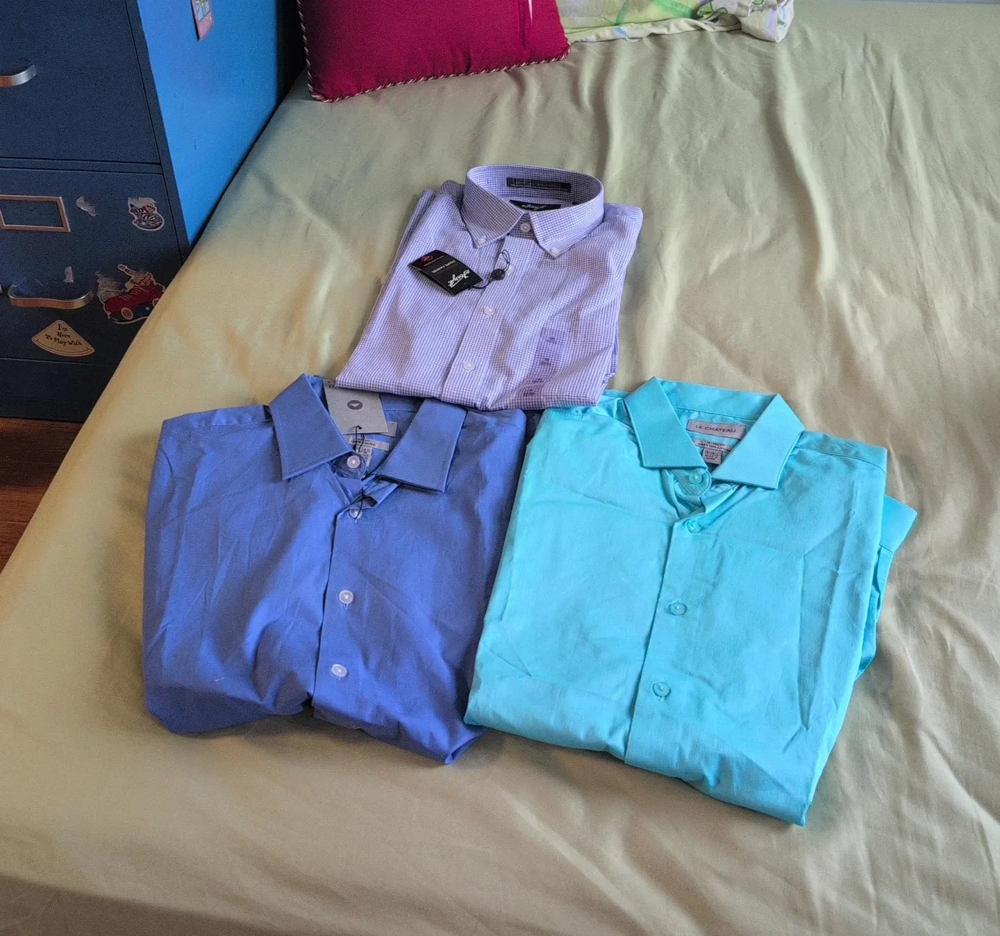 Three men's dress shirts, one purple pinstripe George brand shirt and two solid colour shirts, one blue and one turquoise by Le Château. Button-down collar style.