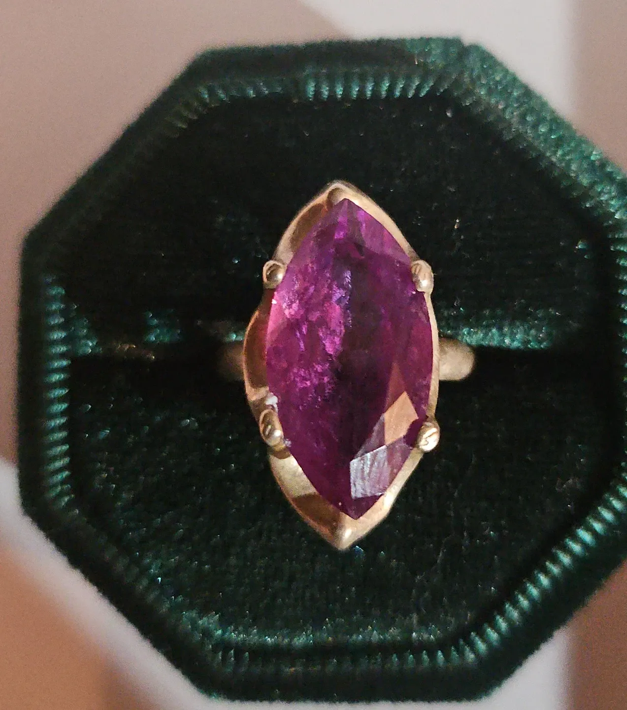 The gemstone has a vibrant purple hue. It's a unique piece for anyone who appreciates statement jewellery. Perfect for adding a pop of colour to any outfit! Just the ring not the box.
