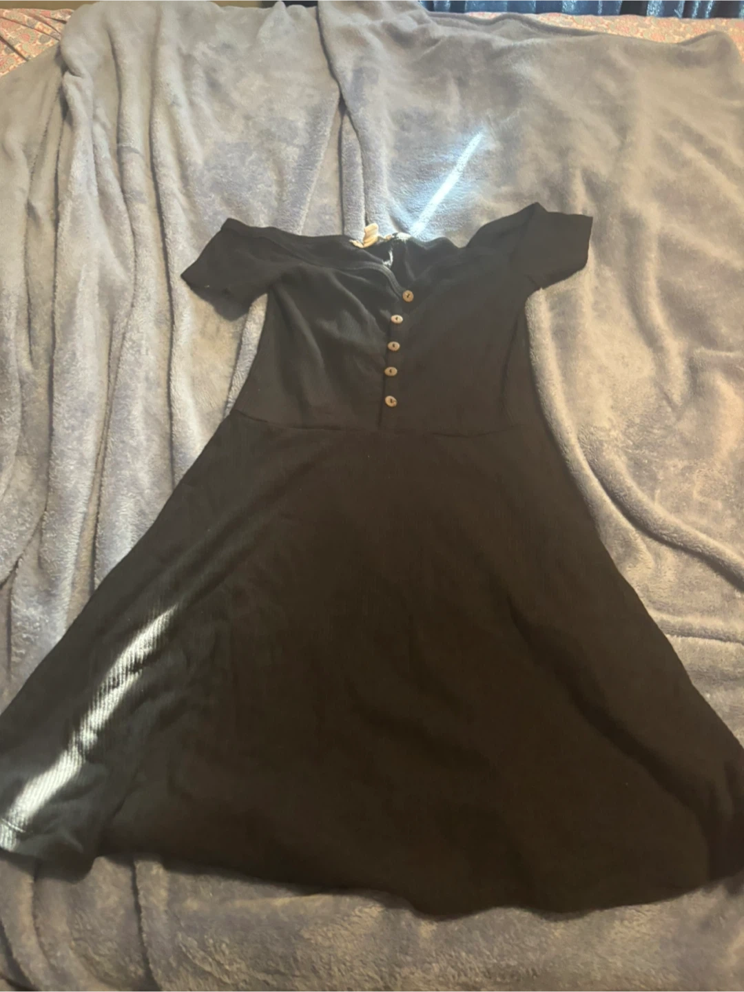 This is a black, off-the-shoulder dress from Urban Heritage. It's a size small with a button-up front. The material feels like a soft jersey knit.