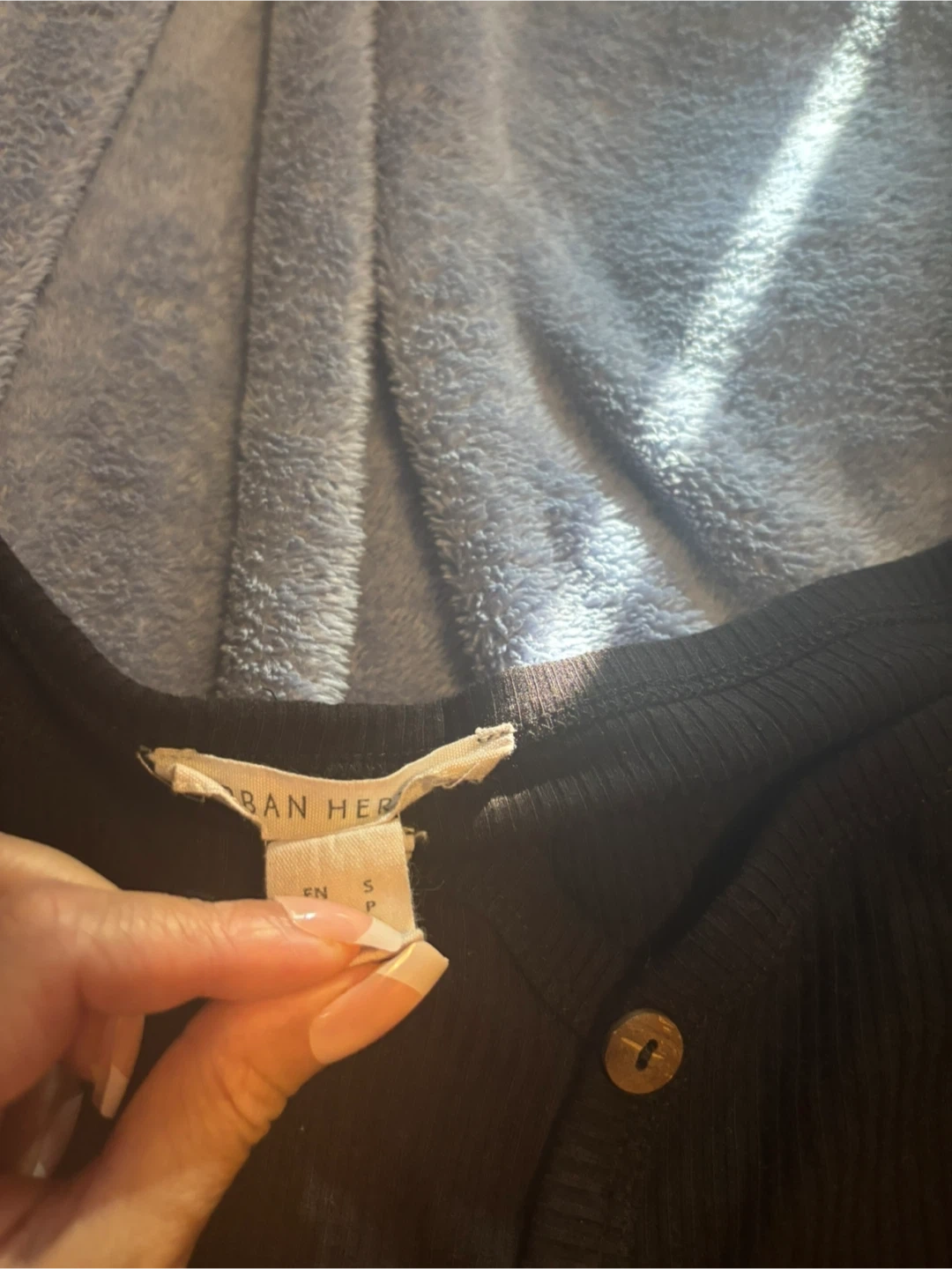 This is a black, off-the-shoulder dress from Urban Heritage. It's a size small with a button-up front. The material feels like a soft jersey knit.