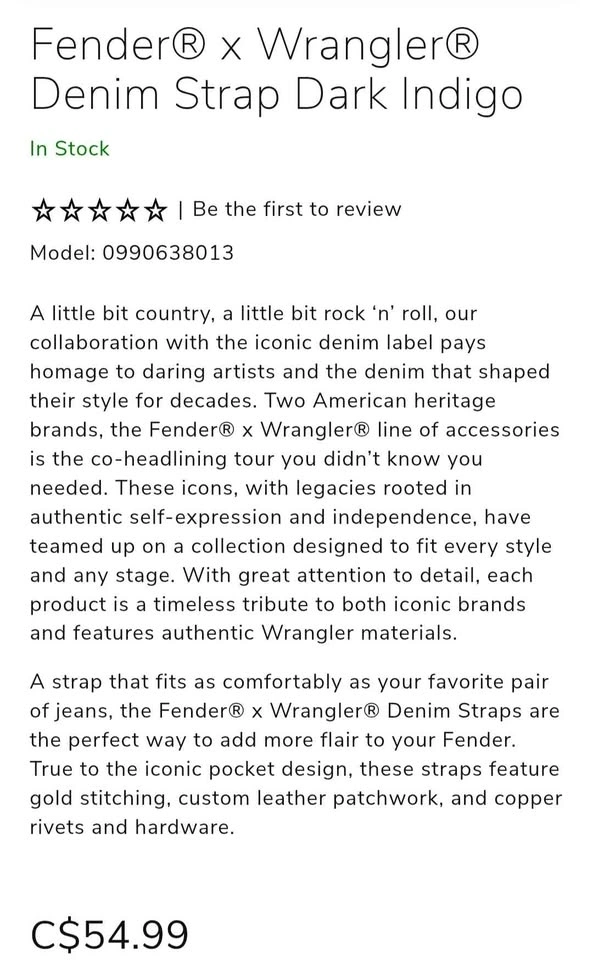 Buy & SellWrangler Fender Denim Guitar Strap (Brand New)Wrangler Fender Denim Guitar Strap (Brand New)$30Brand new product. Cash only. Pick up near Metrotown.WHERE TO MEETCheck LocationView MapSELLERShilohMetrotown100 reviews0 chats·0 favorites·4 viewsSEND CHAT TO SELLERHi Shiloh! I’m interested in your listing.Hi Shiloh! I’m interested in your listing.Get the Karrot app to chatSign In to chat