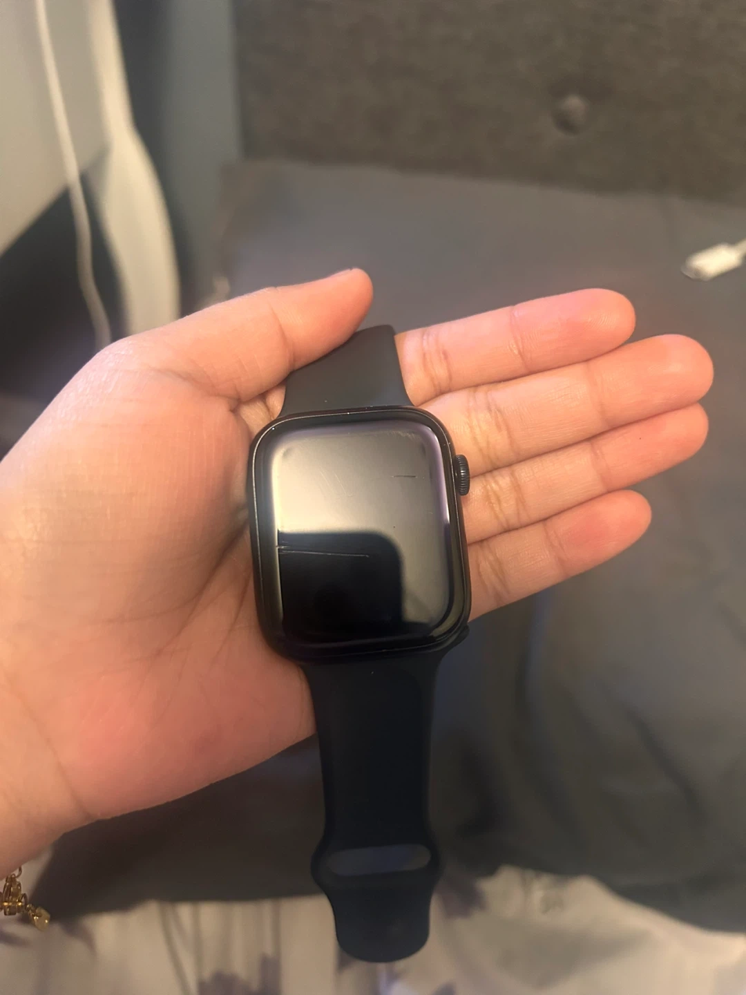 This is an Apple Watch Series 6 with GPS and a 44mm case. It comes with a black sport band and a charging cable. There are some minor scratches on the screen. It's a great smartwatch for tracking fitness and staying connected!