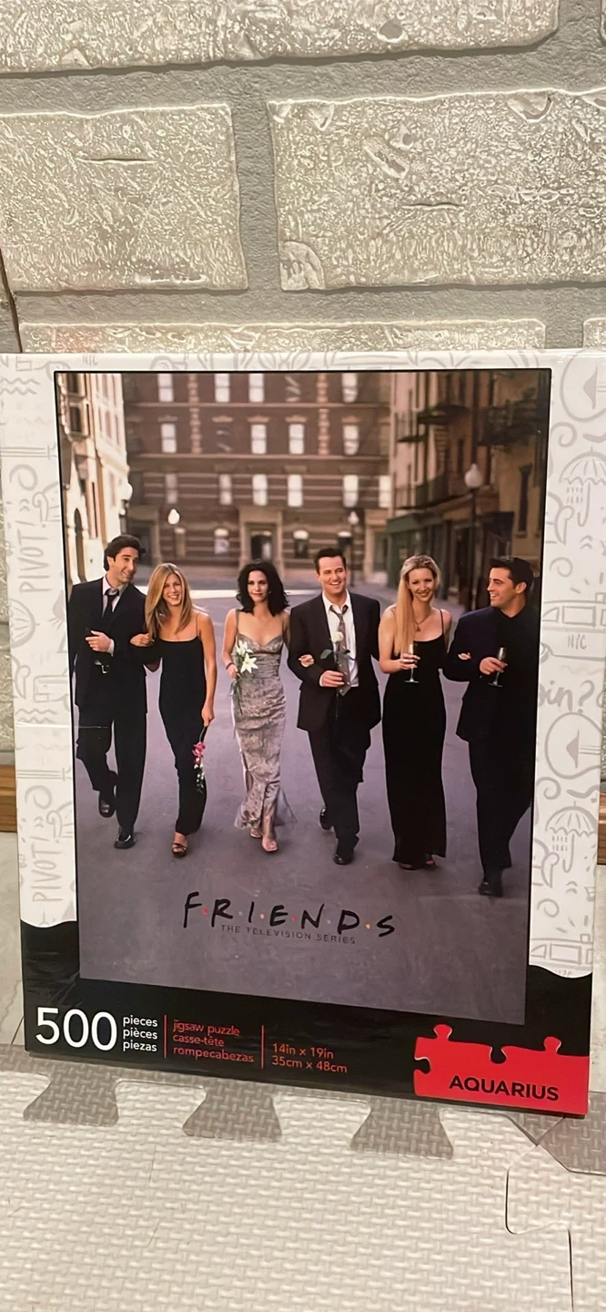 It's a 500-piece jigsaw puzzle featuring the cast of Friends. The finished puzzle measures 14in x 19in (35cm x 48cm). This would be a fun activity for any Friends fan!