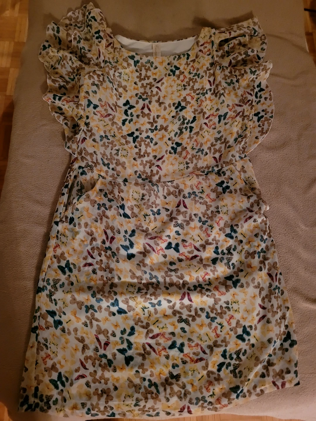 This is a cute short-sleeve dress with a lovely all-over butterfly print. It features a comfortable fit and ruffled sleeves. The fabric is lightweight, making it great for warmer weather.
