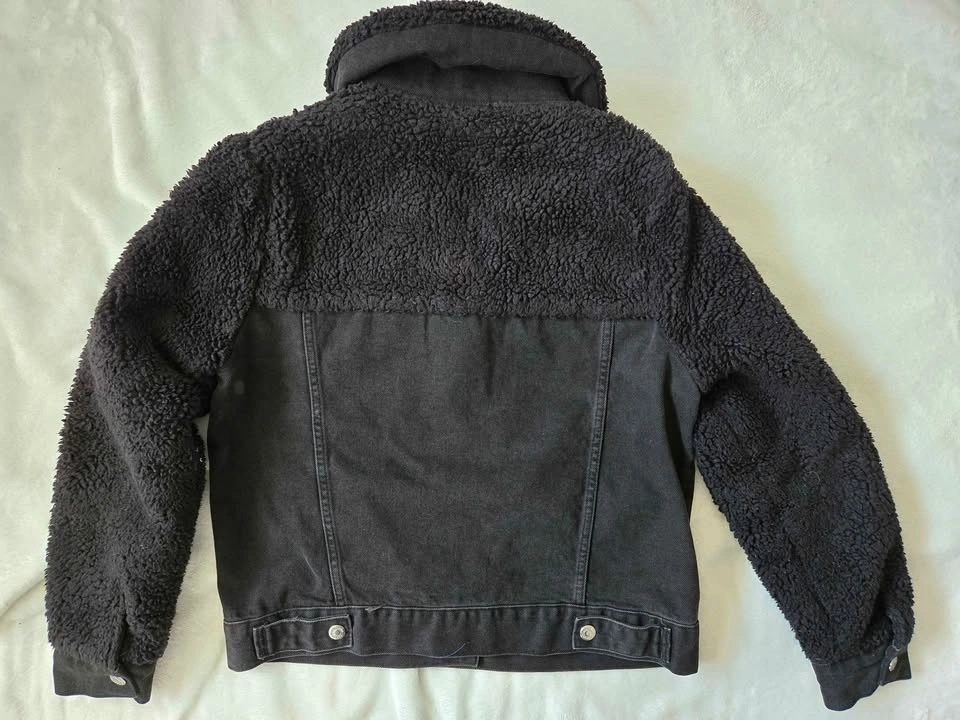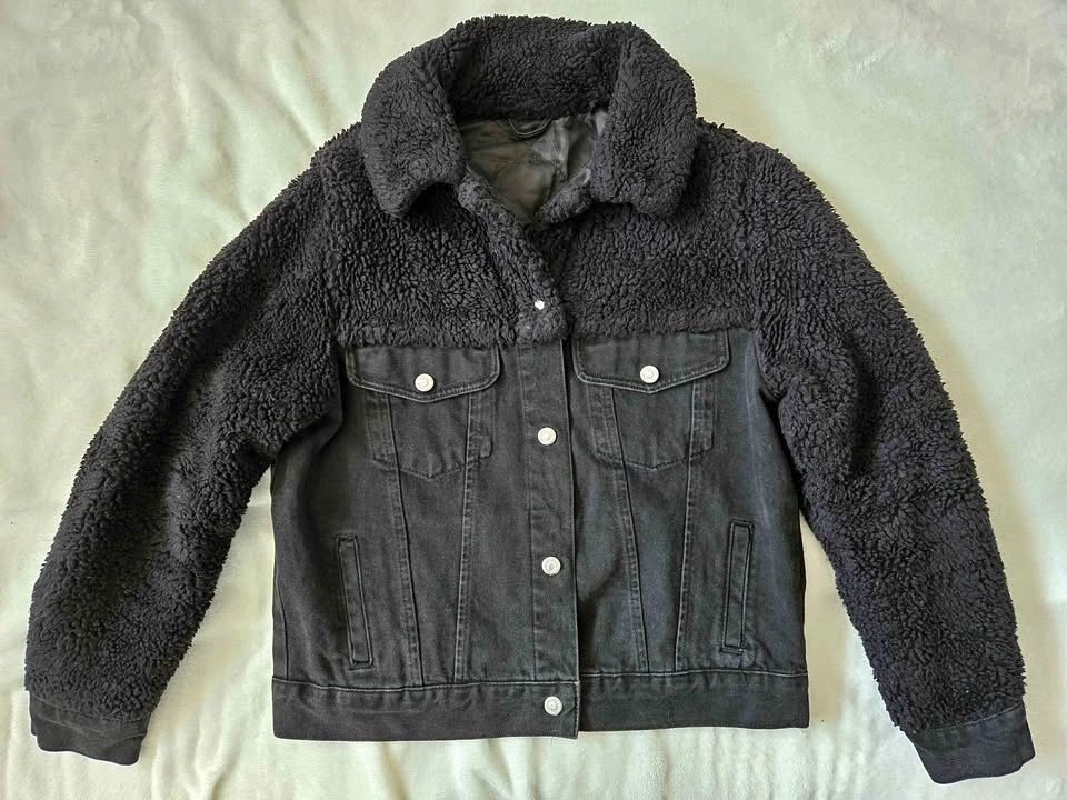 Chic black jean jacket with faux sheepskin collar, sleeves, and shoulders by Top Shop. Size 6. Eur 38. Snap closures in front, chest pockets, and cuffs. Slash pockets in bottom front.