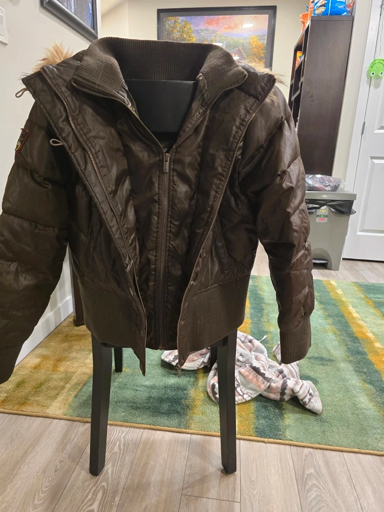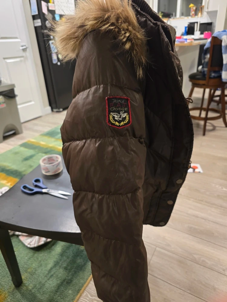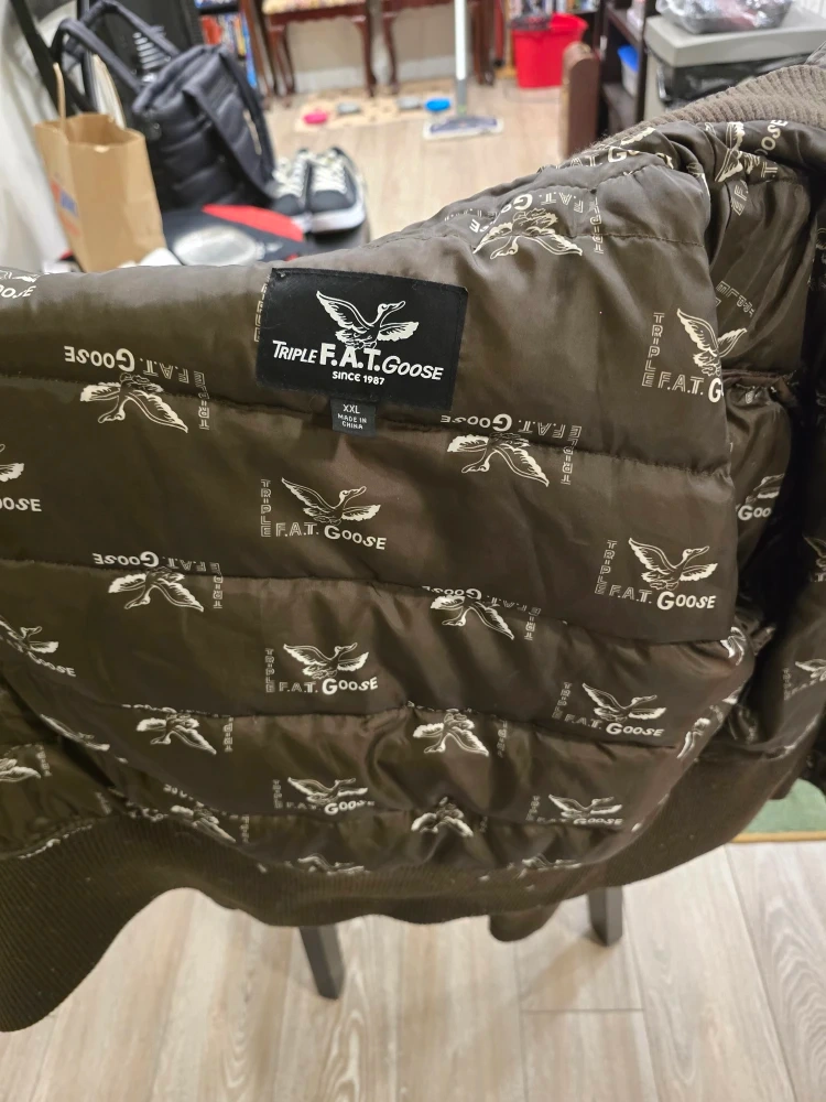 Triple F.A.T. Goose puffer jacket in size XXL. It's a stylish brown colour with a fur-trimmed hood. Perfect for staying warm during the colder months!