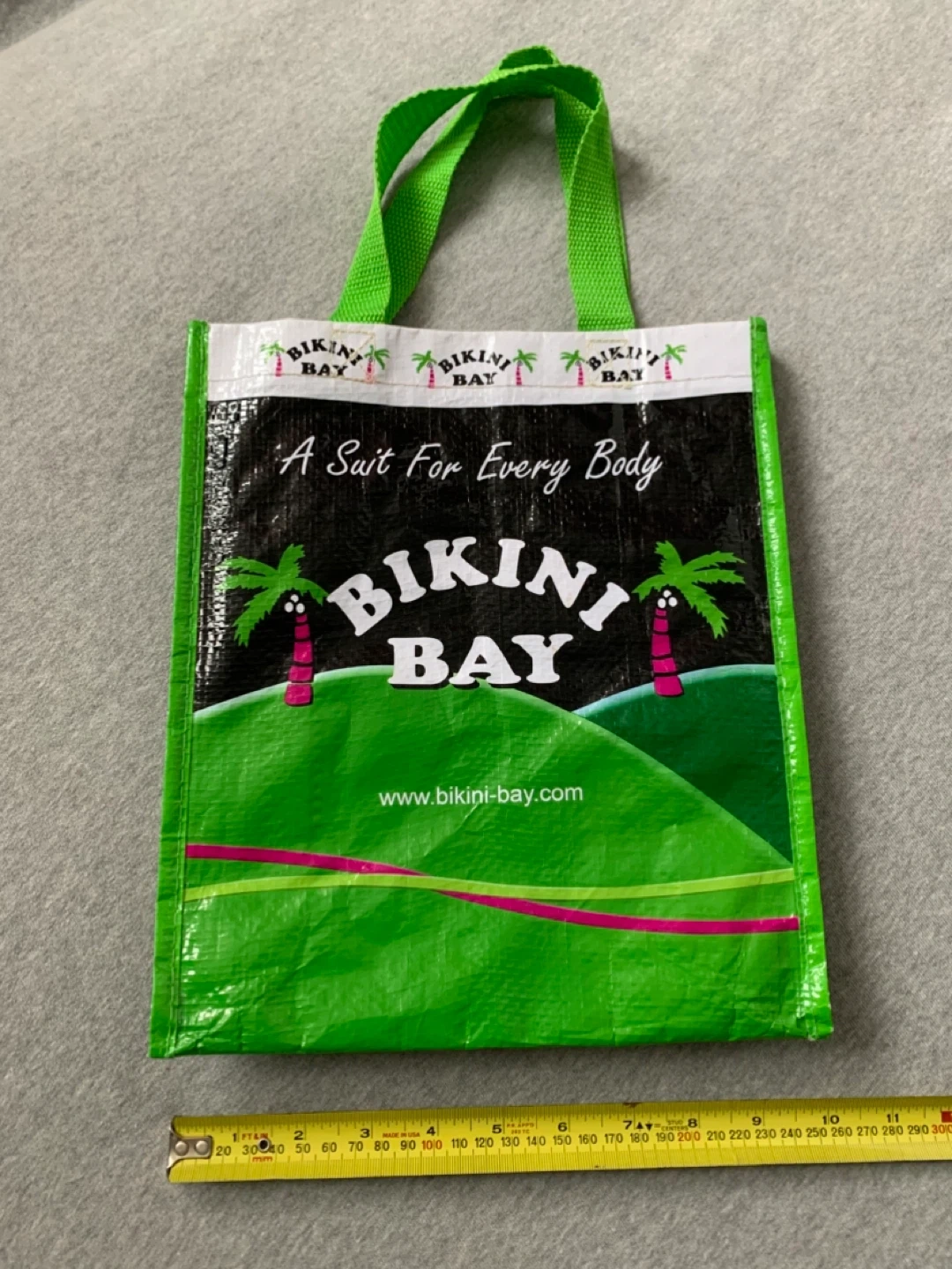 A reusable tote bag from Bikini Bay featuring a tropical beach theme and "A Suit For Every Body" slogan. It has green handles and a durable, woven material. The website www.bikini-bay.com is printed on the back.