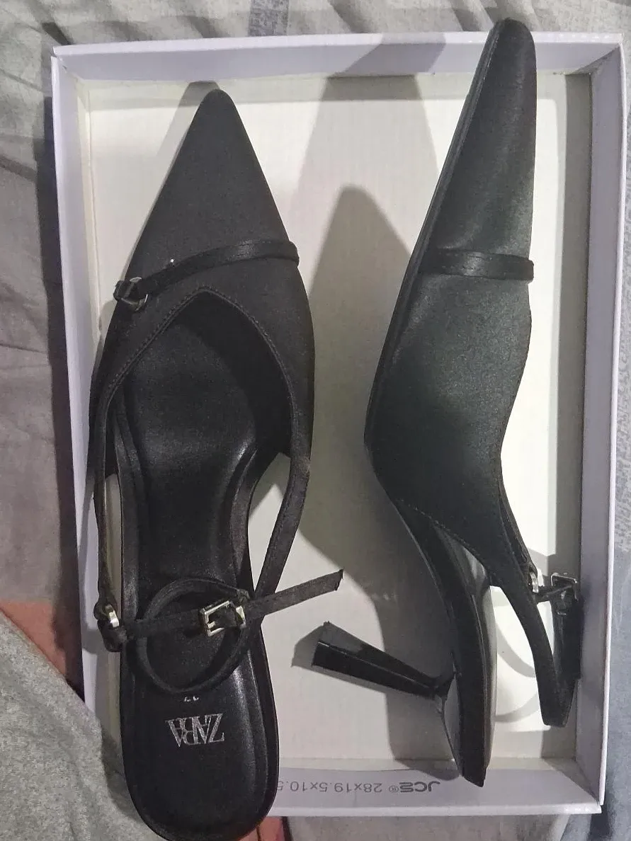 These are black slingback heels from Zara. They feature a pointed toe and adjustable ankle straps with buckle closures. The material appears to be satin.