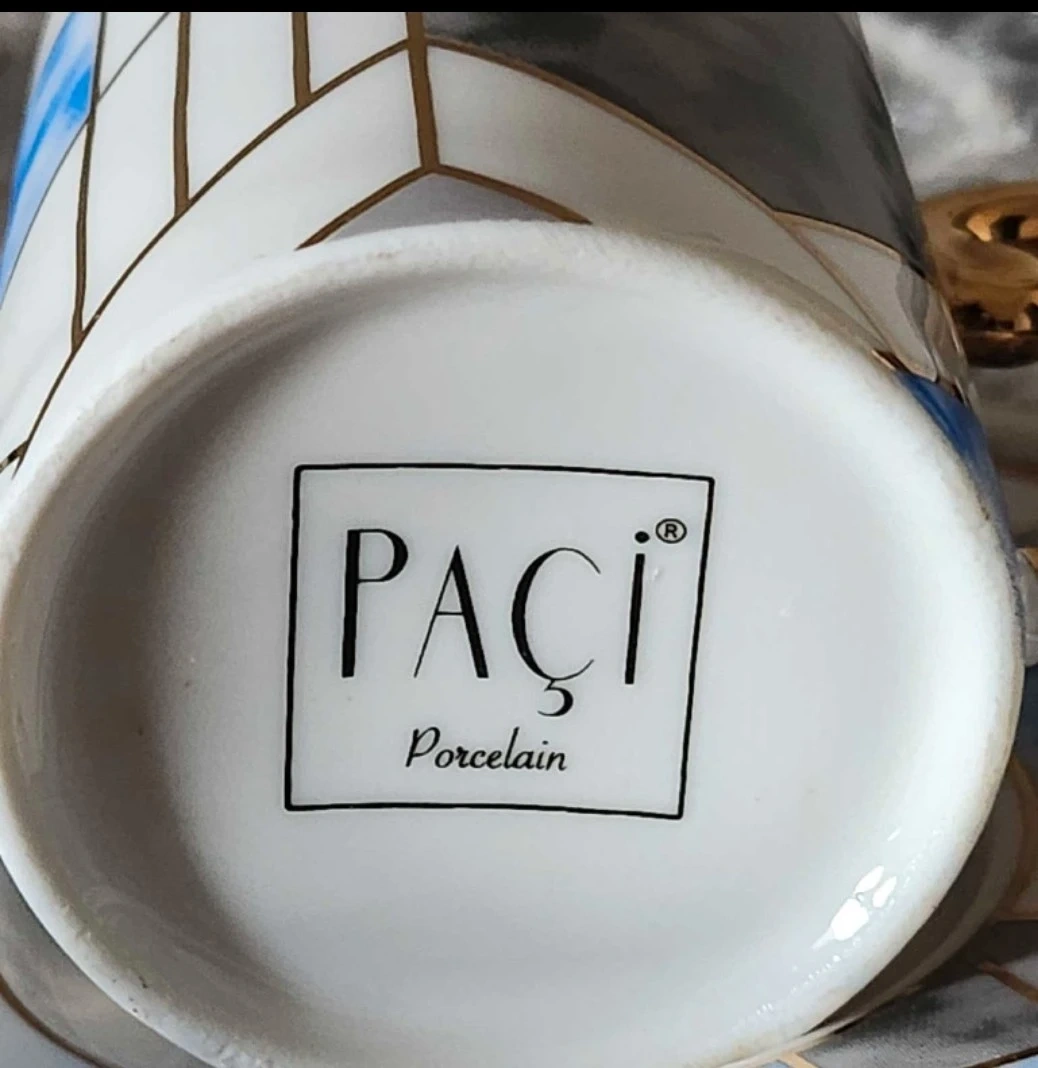 Elegant espresso cup and saucer set Paci Porcelain, Six pieces. Gold-toned handles. Geometric design. Blue, grey, and gold colours. New in box. call Tomi 514 571 8606