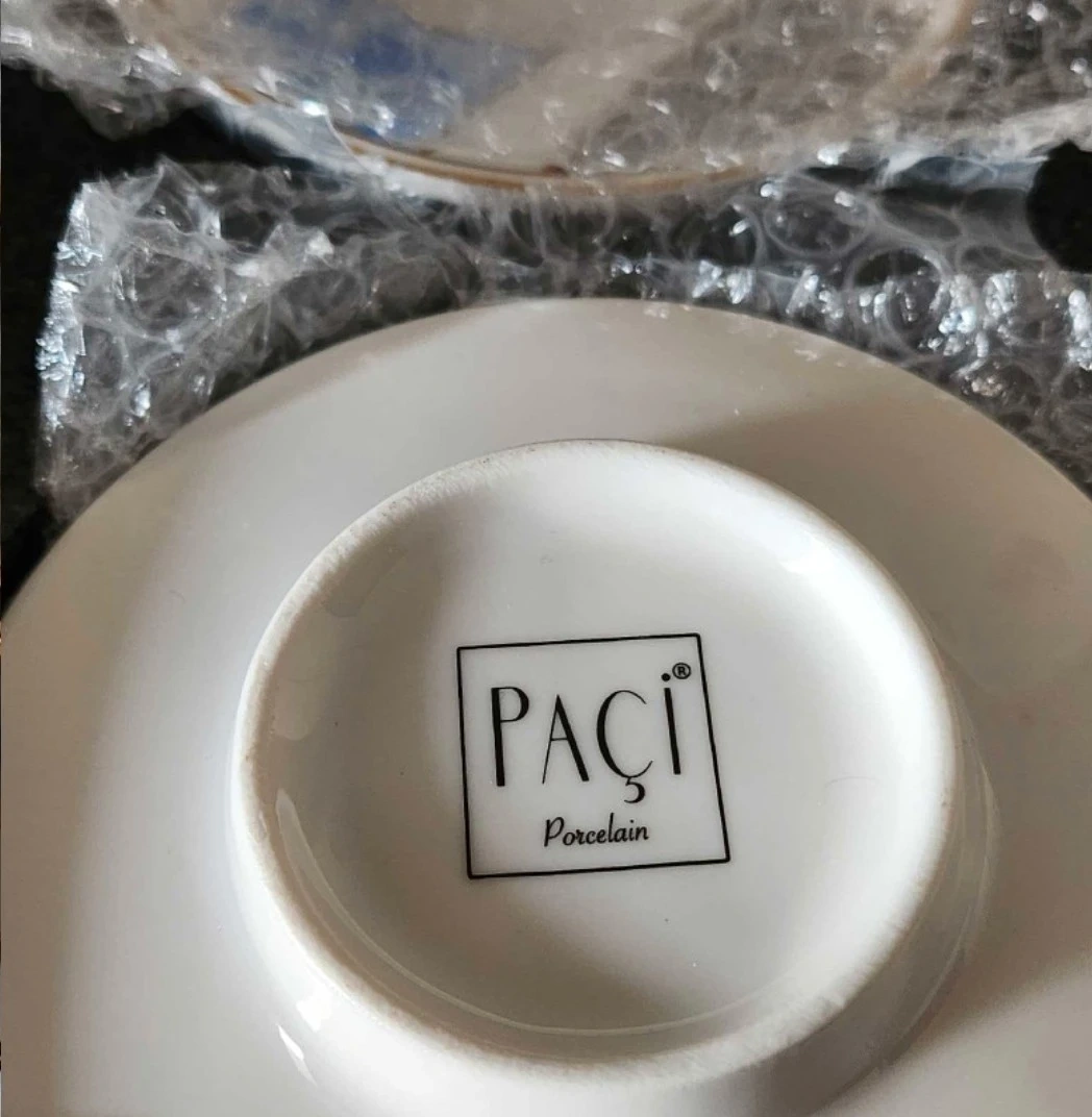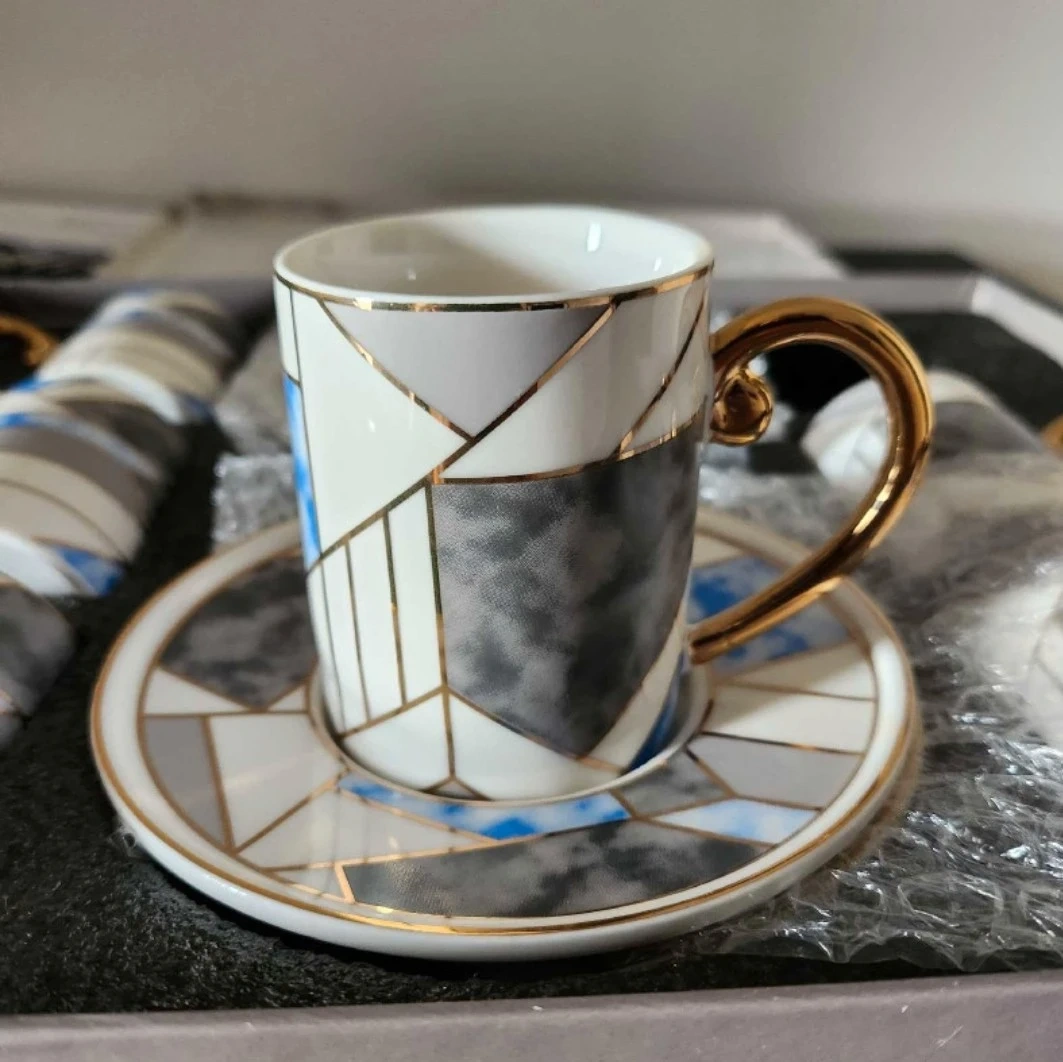 Elegant espresso cup and saucer set Paci Porcelain, Six pieces. Gold-toned handles. Geometric design. Blue, grey, and gold colours. New in box. call Tomi 514 571 8606