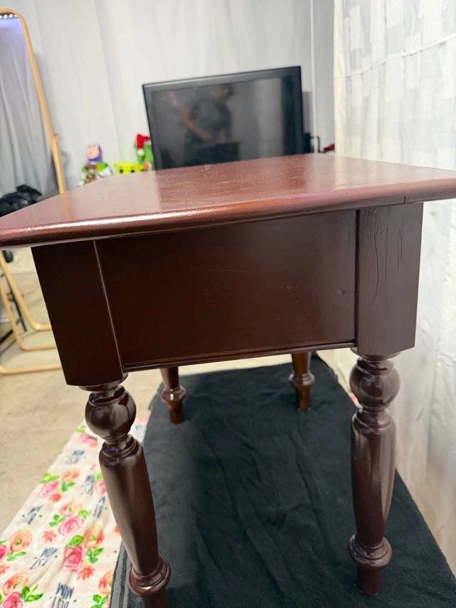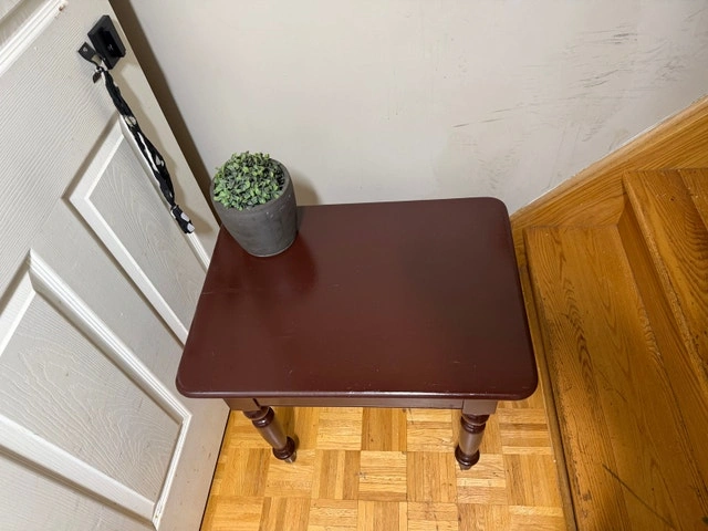 This is a dark brown, used side table, perfect for any room in your house. It has some wear and tear, but it's still in good condition and ready for a new home. It's the perfect size to hold a lamp, books, or your favourite plant! If you're reading this, it's still available! Cash accepted.