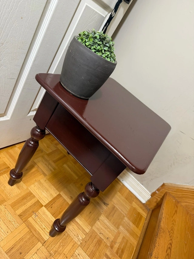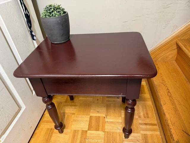 This is a dark brown, used side table, perfect for any room in your house. It has some wear and tear, but it's still in good condition and ready for a new home. It's the perfect size to hold a lamp, books, or your favourite plant! If you're reading this, it's still available! Cash accepted.