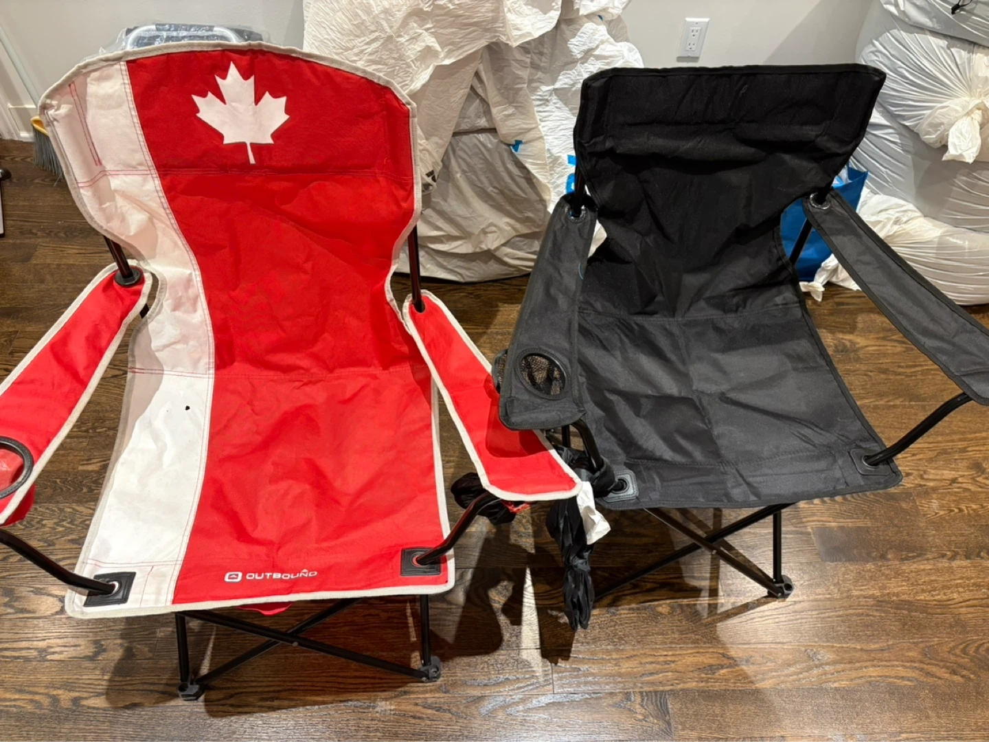 Two folding camping chairs, one with a Canadian flag design and the other black. Both have cup holders built into the arms. Great for backyard BBQs or camping trips!