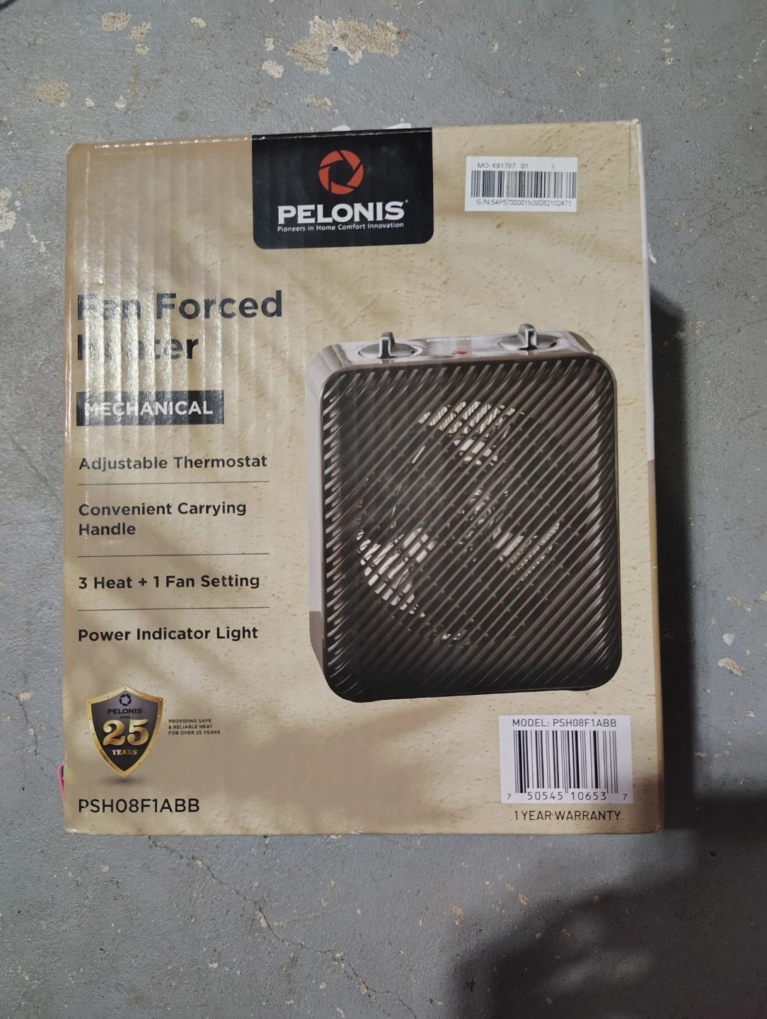 This Pelonis fan forced heater is black and comes with a mechanical adjustable thermostat. It offers 3 heat settings and 1 fan setting. It also includes a convenient carrying handle and a power indicator light. Only used once