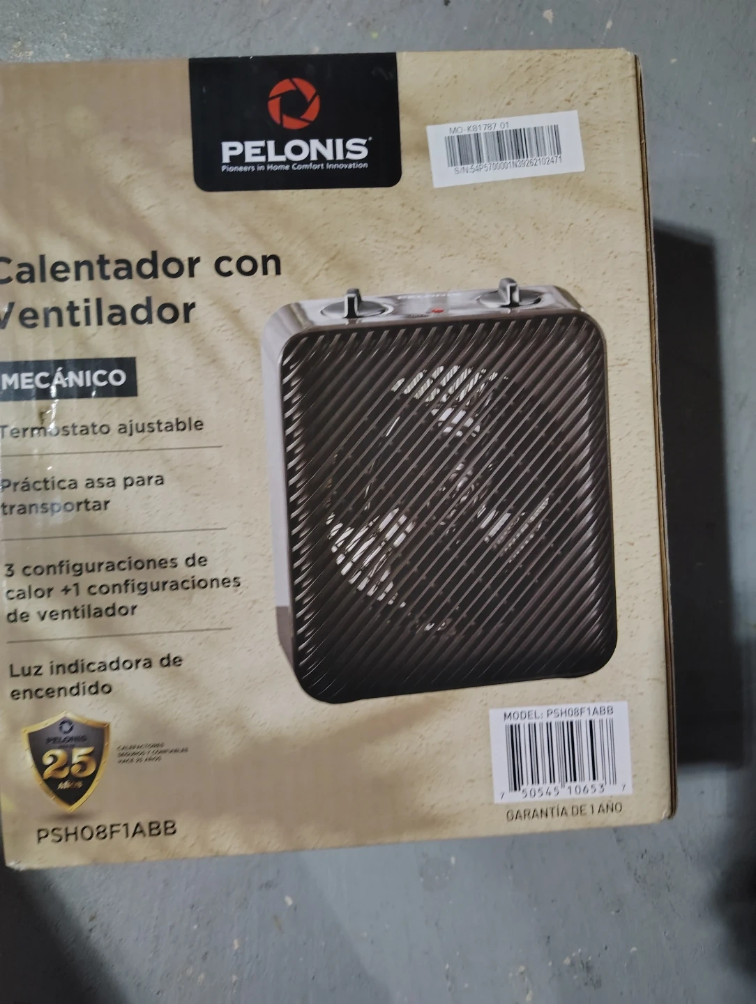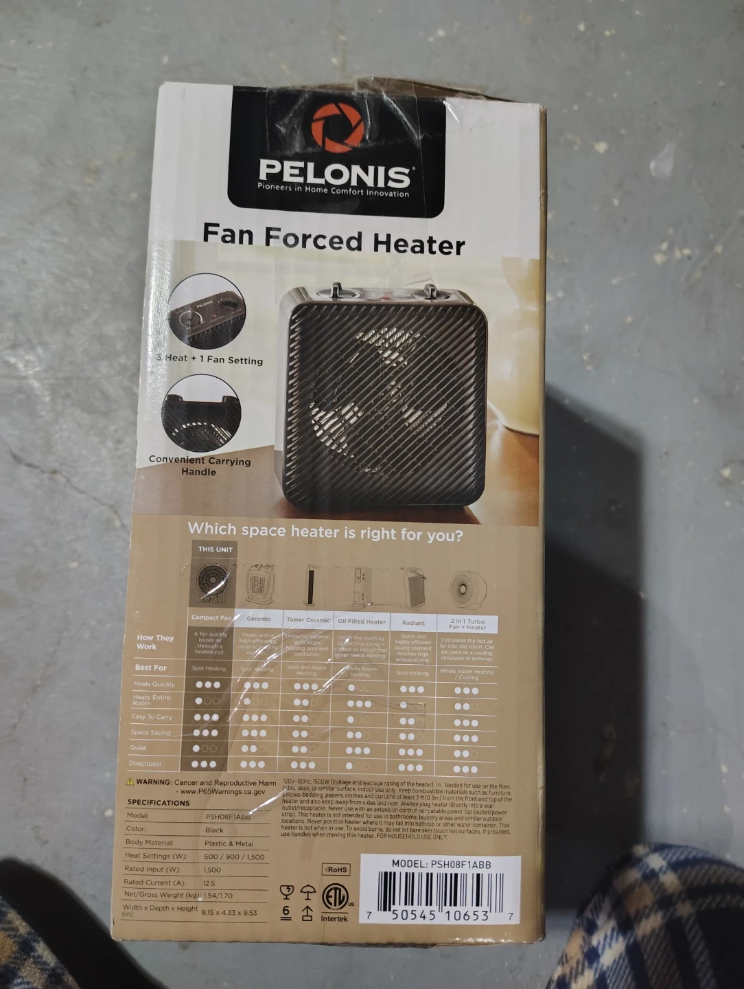 This Pelonis fan forced heater is black and comes with a mechanical adjustable thermostat. It offers 3 heat settings and 1 fan setting. It also includes a convenient carrying handle and a power indicator light. Only used once
