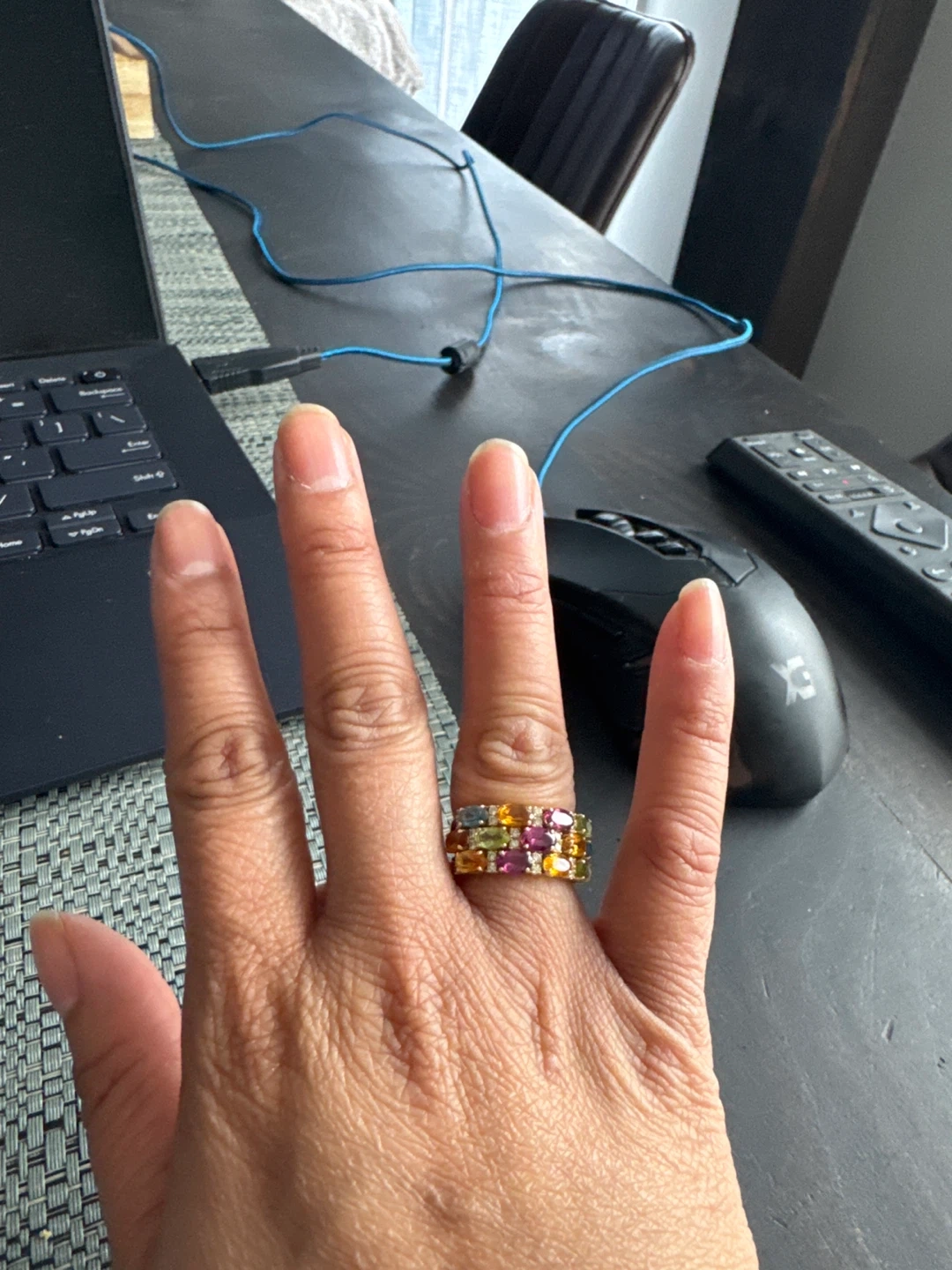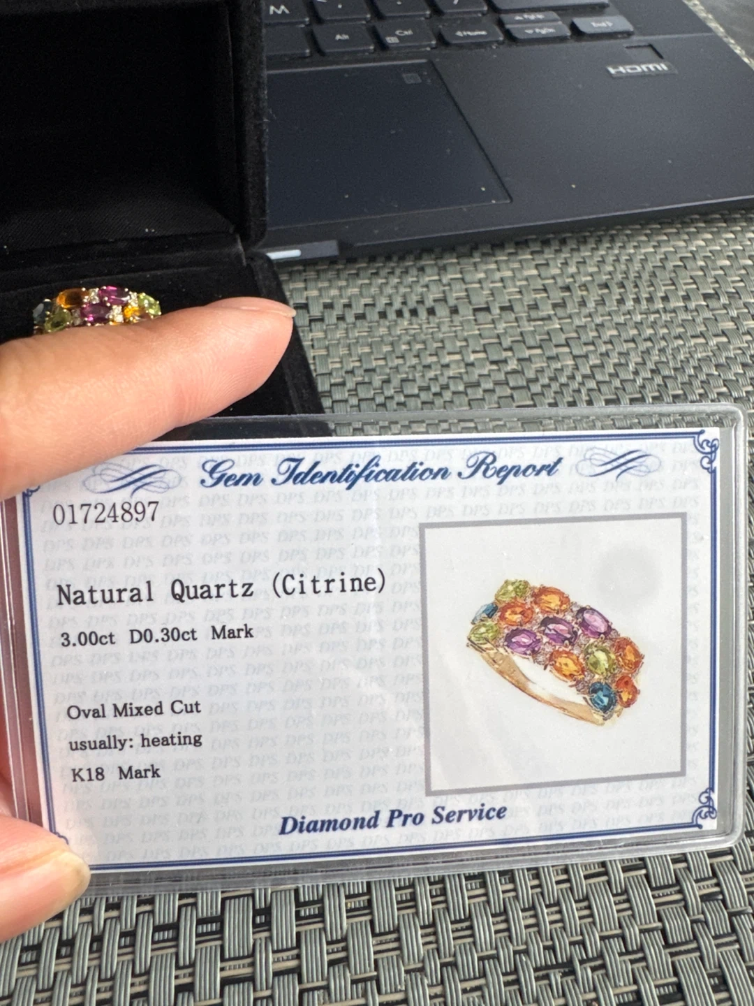 This ring features an oval mixed cut of natural quartz, with a total carat weight of 3.00ct D.30ct. It's marked K18, indicating 18K gold. This piece would add a colourful accent to any jewellery collection.