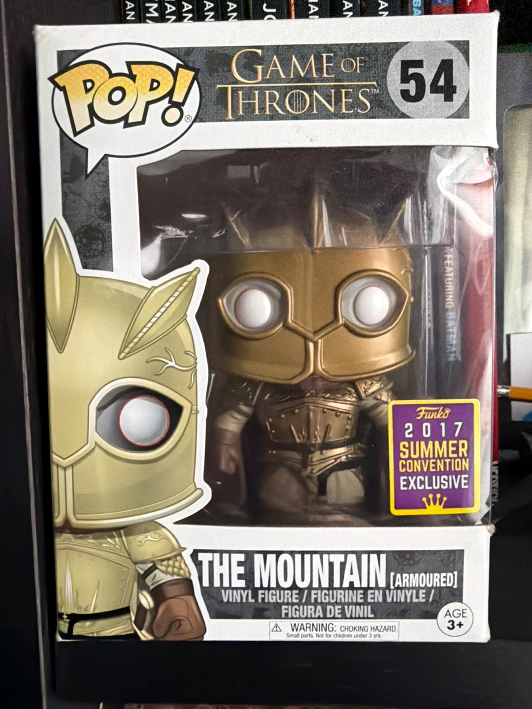 Selling a Funko Pop! figure of The Mountain (Armoured) from Game of Thrones. This is a 2017 Summer Convention Exclusive, featuring Batman. It's a vinyl figure and recommended for ages 3+