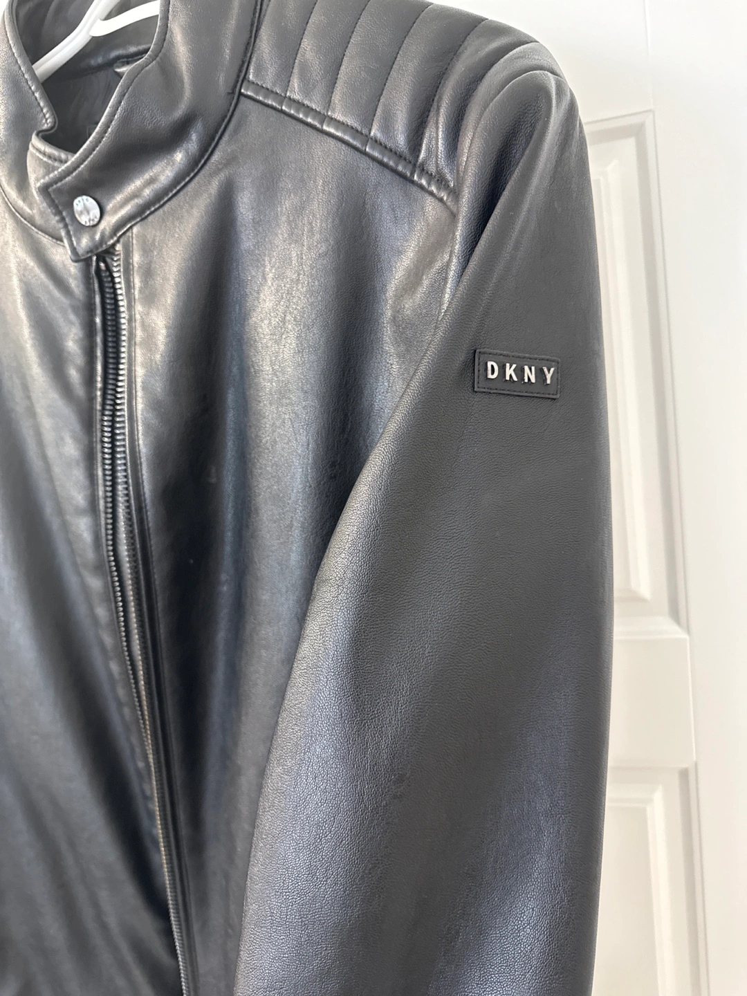 Selling a stylish black leather jacket from DKNY. It's in great condition and has a sleek, modern look. Perfect for adding a touch of edge to your wardrobe! Size M-L. Check other listings for more.