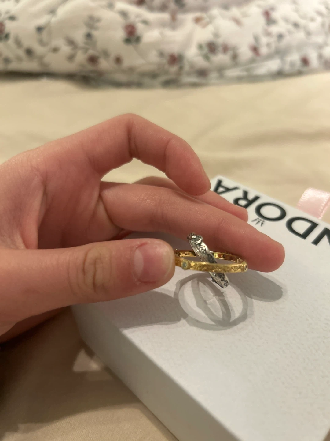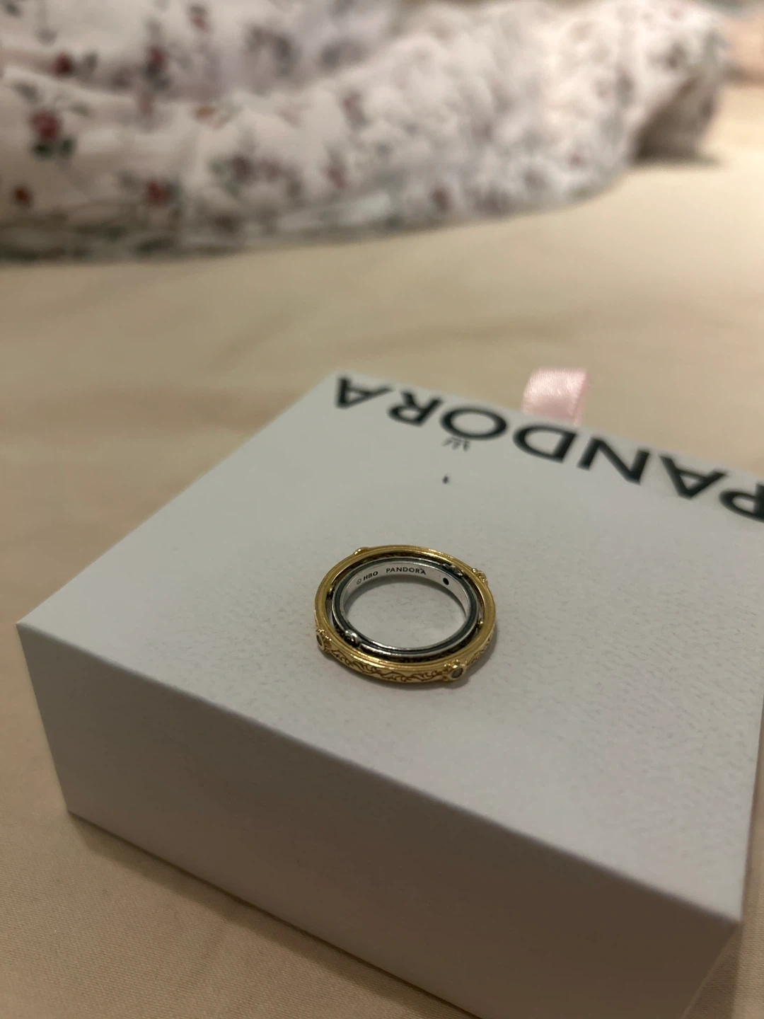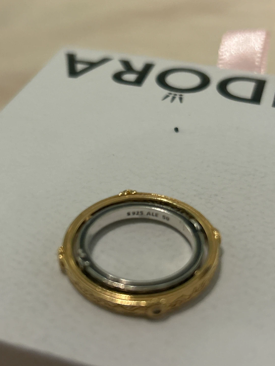 This Pandora ring is made of S925 sterling silver and features a gold-tone outer band with intricate detailing. The size is 50. Price is Firm.