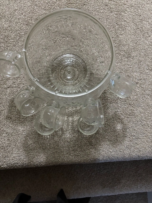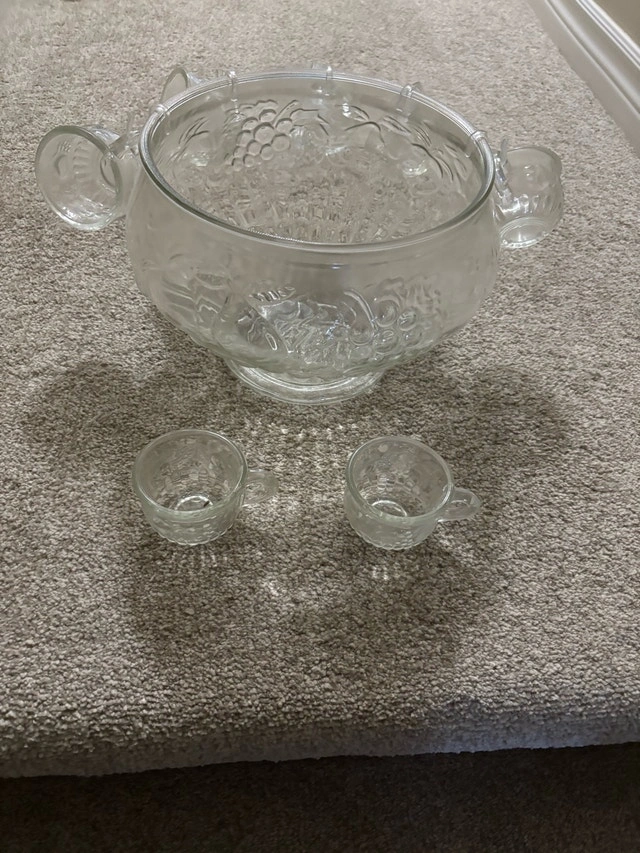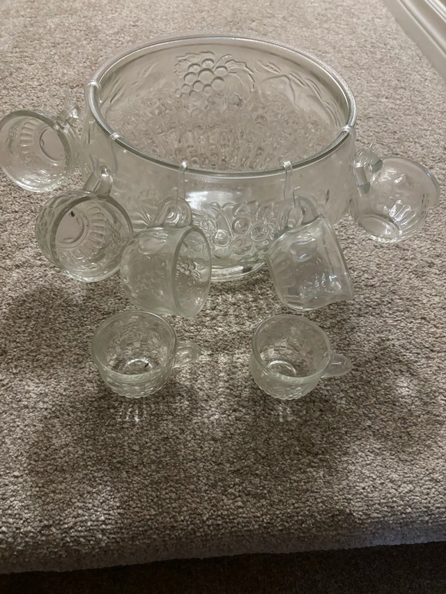 This used punch bowl set includes a large punch bowl with a beautiful grape design and several matching cups. Perfect for parties and gatherings, this set is in good condition and ready to add a touch of elegance to your next event. Cash accepted.