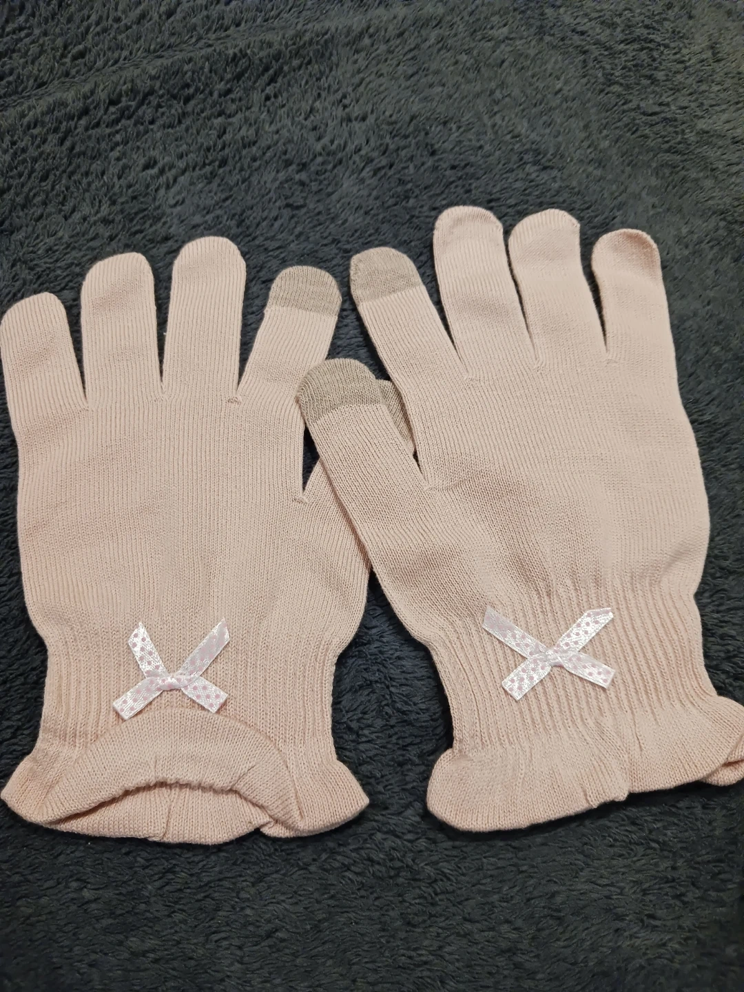 Stay warm and connected with these light pink knit gloves. They feature touch-sensitive fingertips for easy smartphone use and a cute bow detail on each wrist. The ruffled cuff adds a stylish touch.