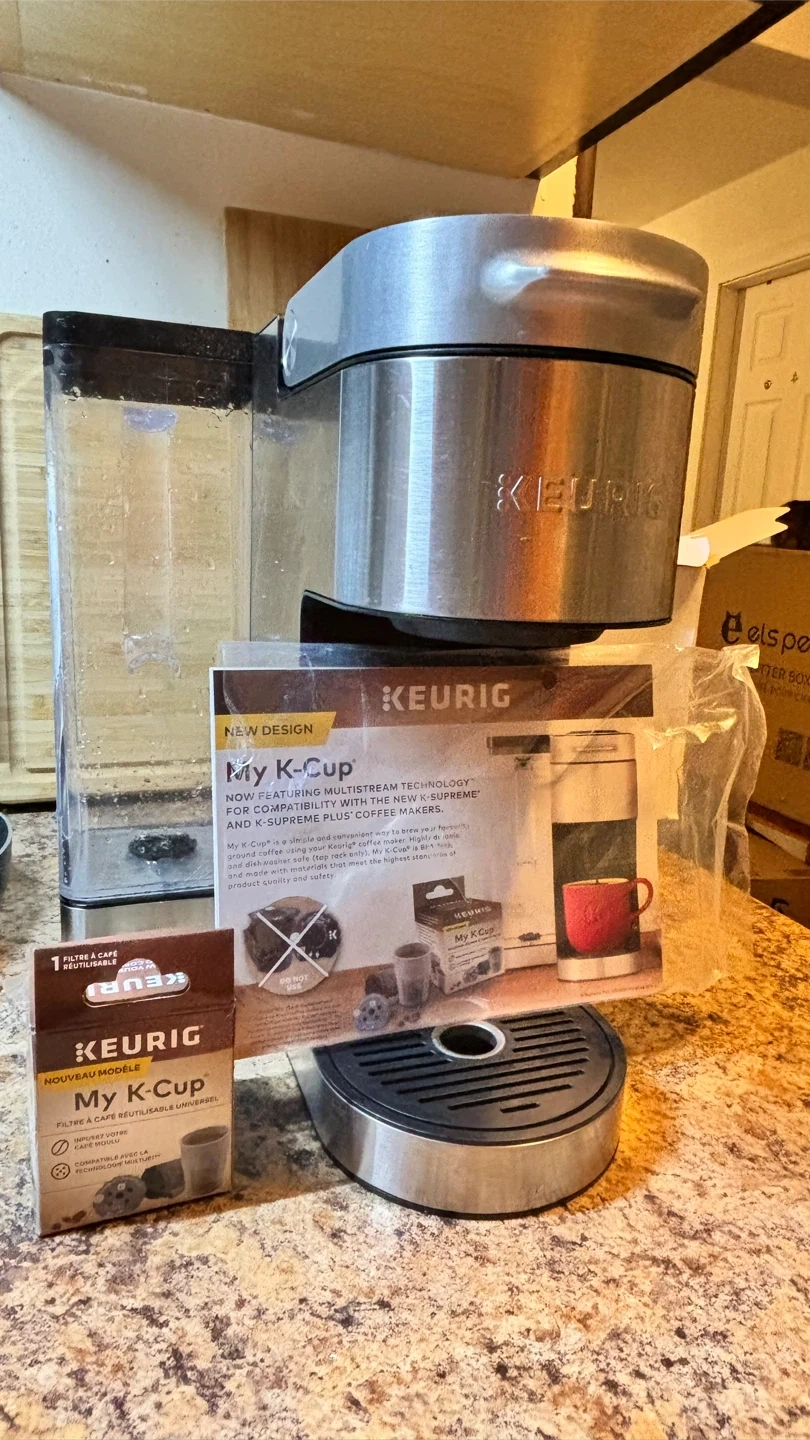 Keurig K-Supreme Plus coffee maker with MultiStream Technology. It features a removable water reservoir and a reusable My K-Cup filter. Brews coffee using your Keurig K-Cup pods.