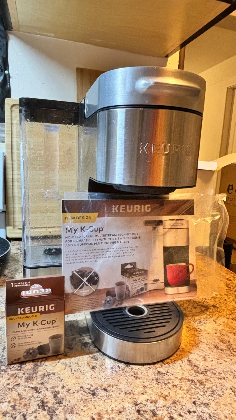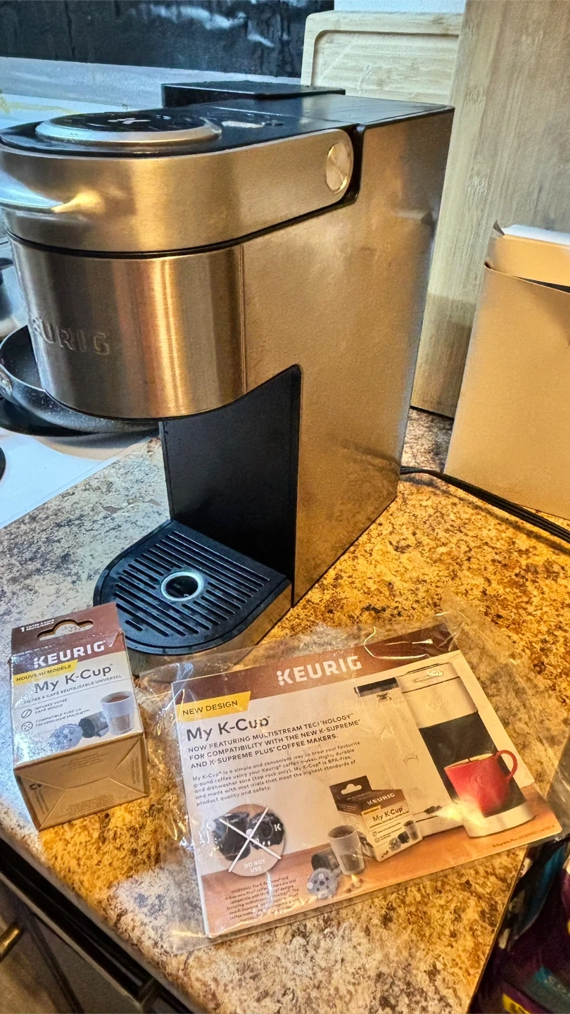 Keurig K-Supreme Plus coffee maker with MultiStream Technology. It features a removable water reservoir and a reusable My K-Cup filter. Brews coffee using your Keurig K-Cup pods.