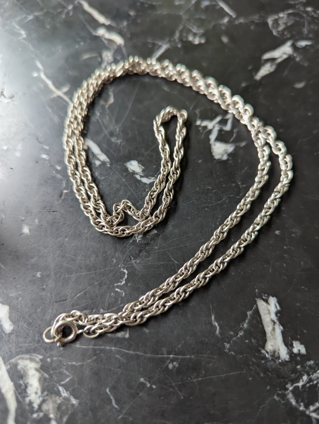 A very nice metal necklace, not certain of the type of metal. Sturdy construction. No signs of wear or abuse. A nice chain design. Can be worn alone or used for a pendant or charms.