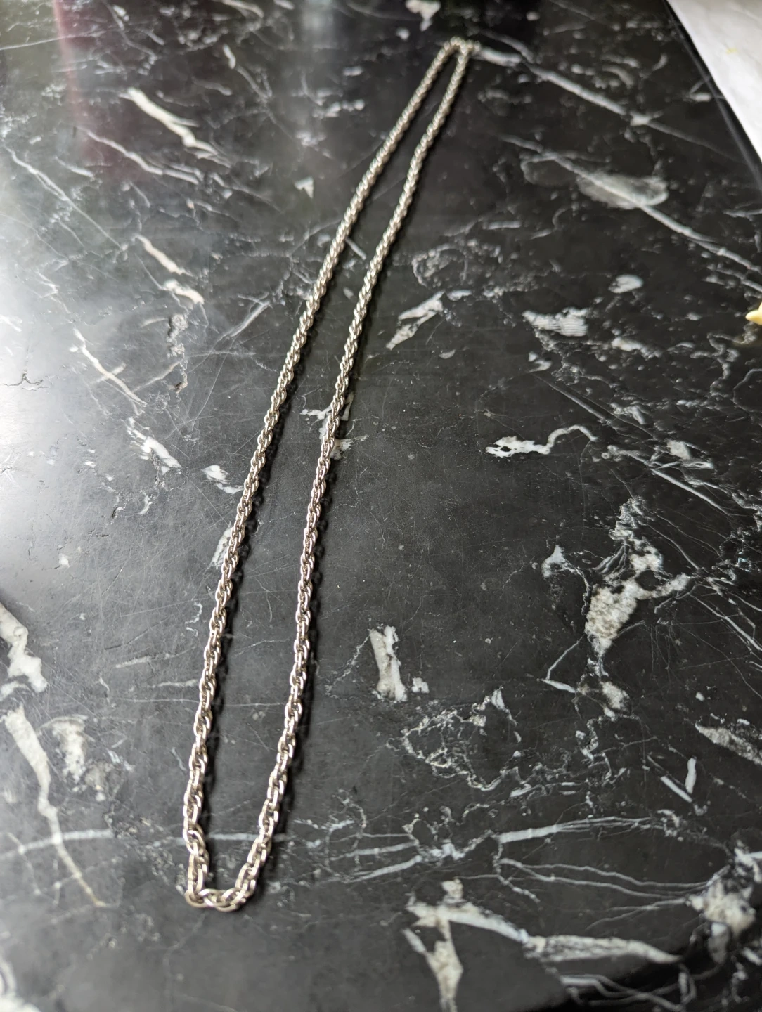 A very nice metal necklace, not certain of the type of metal. Sturdy construction. No signs of wear or abuse. A nice chain design. Can be worn alone or used for a pendant or charms.