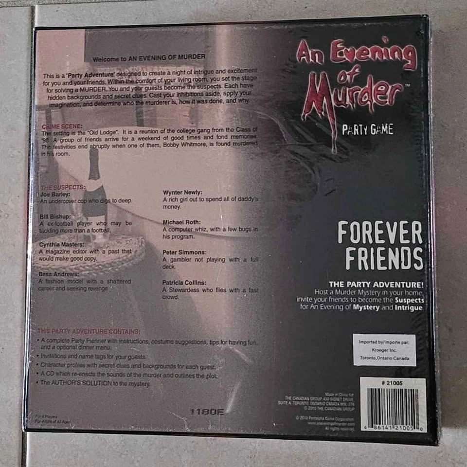 Host your friends for an evening of murder with this murder mystery game. It has everything you need except the guests who are also the suspects. This murder mystery has never been solved. Unopened and ready for play.