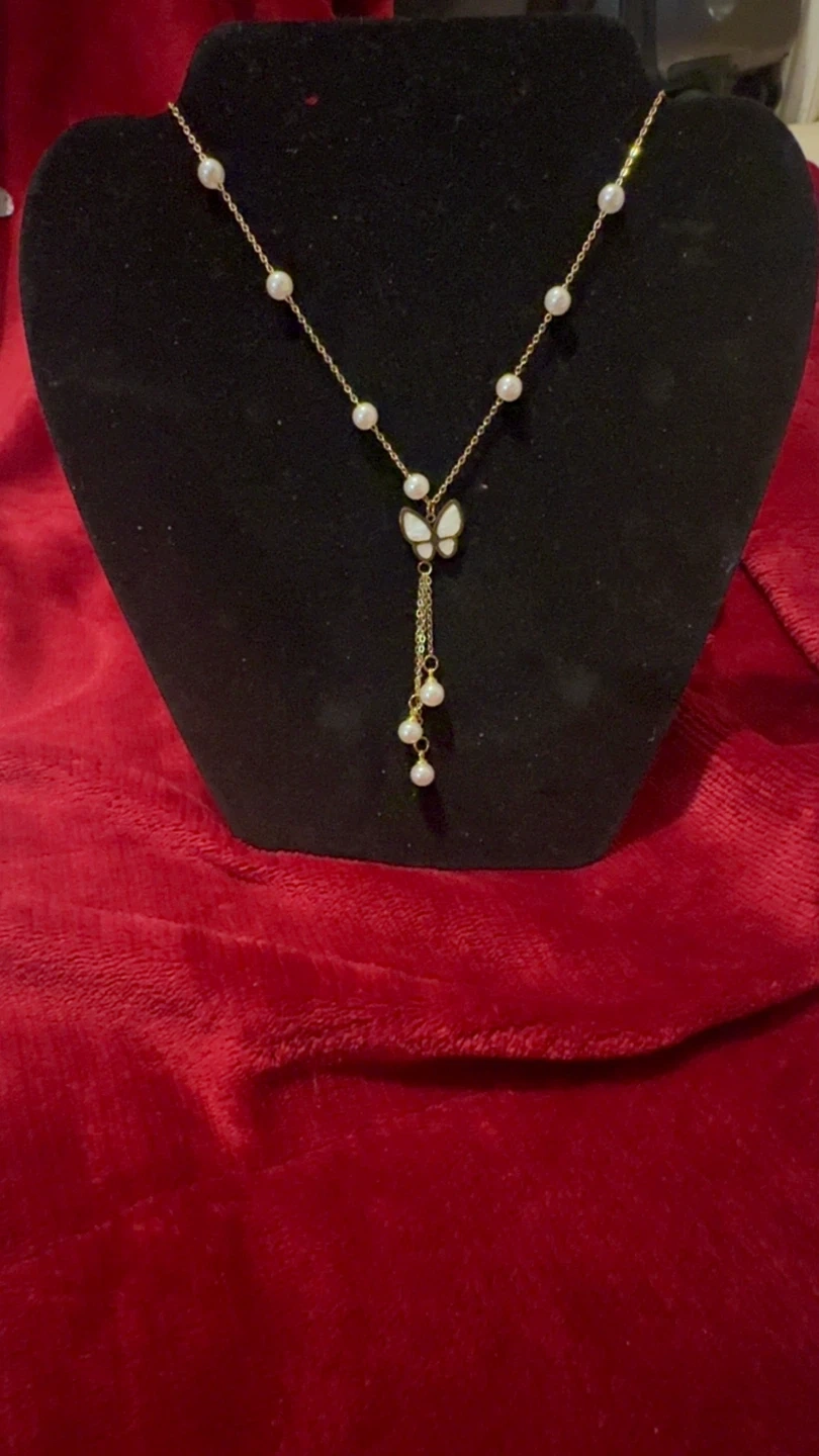 This delicate gold-tone necklace features a charming butterfly pendant. It's adorned with small pearls along the chain and a dangling pearl accent below the butterfly. The necklace has a drop design with the pearls and butterfly. 2 PIECE LEFT…✨✨✨