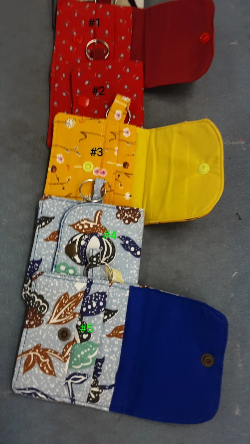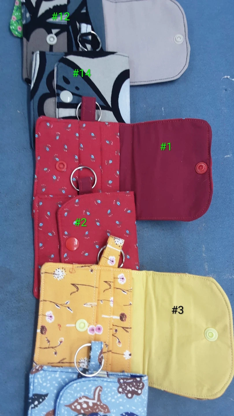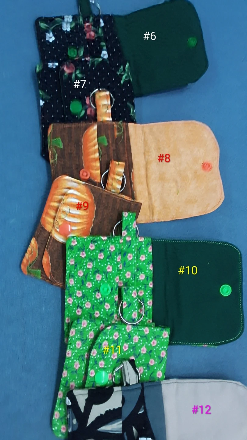 Small handmade fabric card purses. Each purse features a unique pattern, including floral, pumpkin, and abstract designs. It's a great way to keep small essentials organized! They are 8.00 each or 2 for 15.00