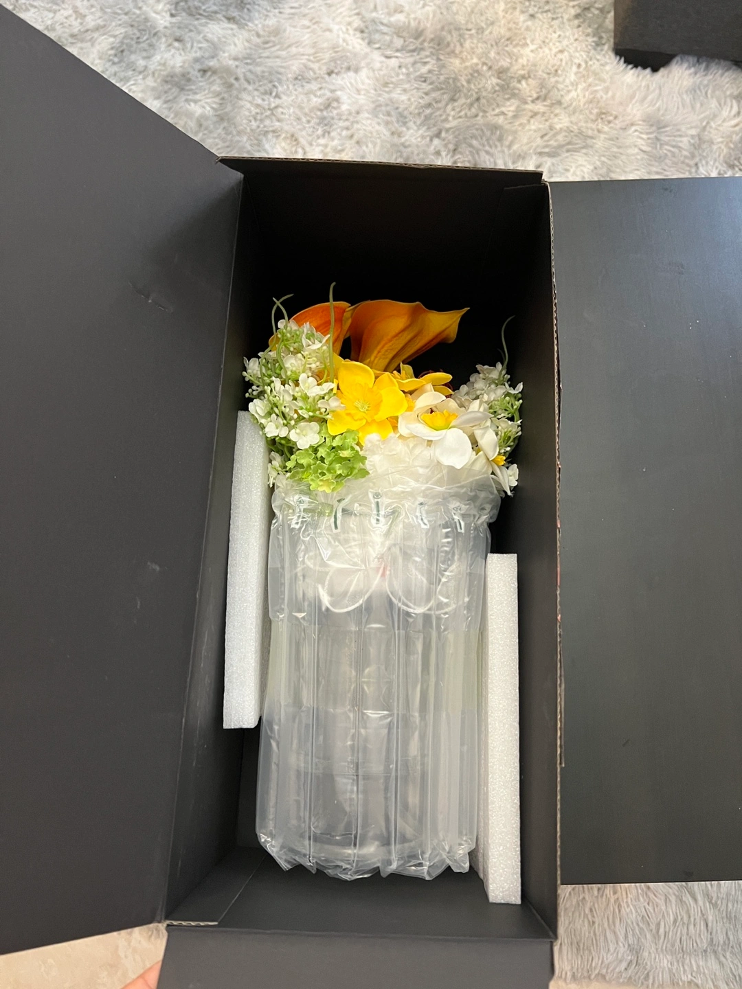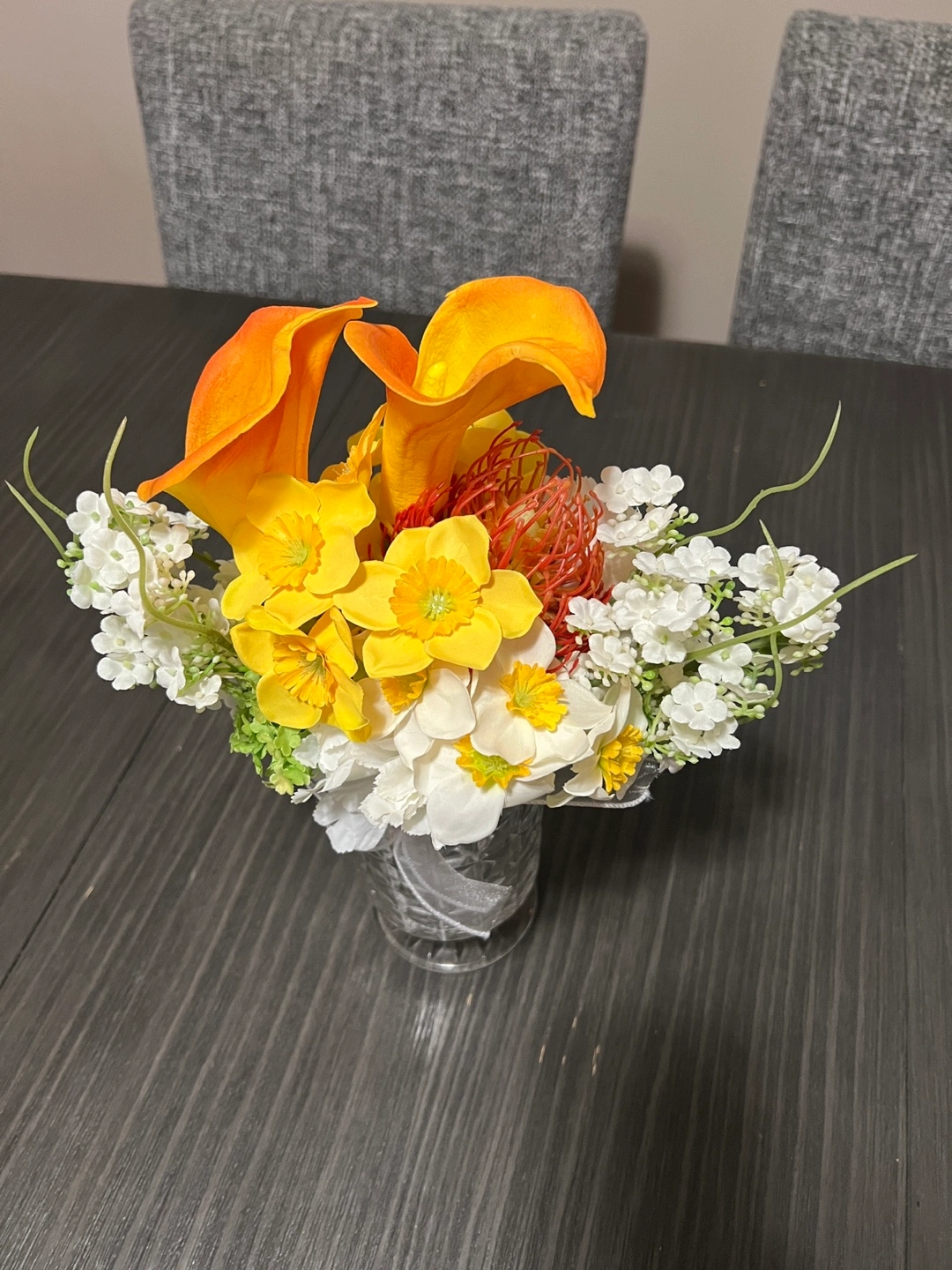 Beautiful artificial flower arrangement. Features orange calla lilies, yellow and white flowers. Arranged in a clear crystal vase with a pedestal base. New, never displayed. Packaged carefully in a black box.