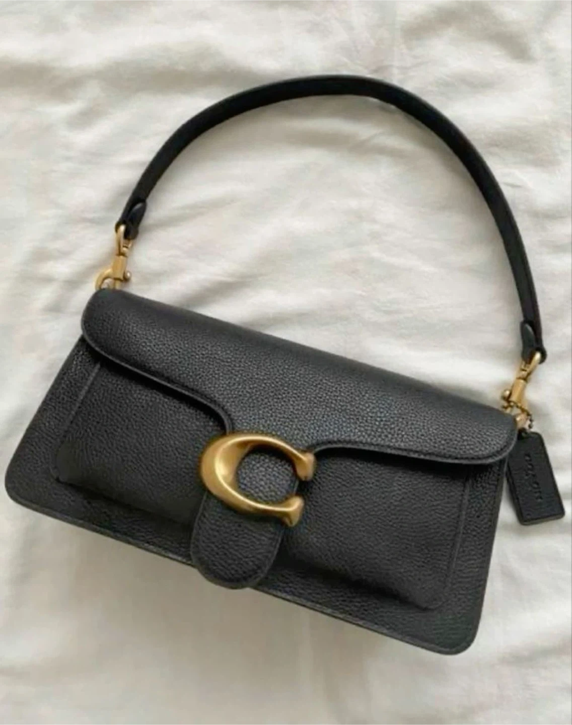 A black pebble leather Coach Tabby Shoulder Bag 26 with brass hardware. It features the iconic C logo on the front closure. The bag has a single top handle and a shoulder strap.