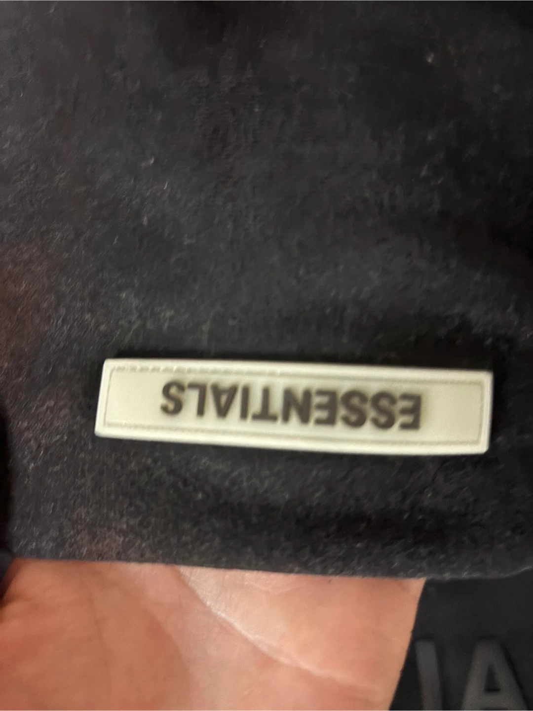 This is a black Fear of God Essentials hoodie. It's made of a soft cotton blend. This hoodie is great for everyday wear.