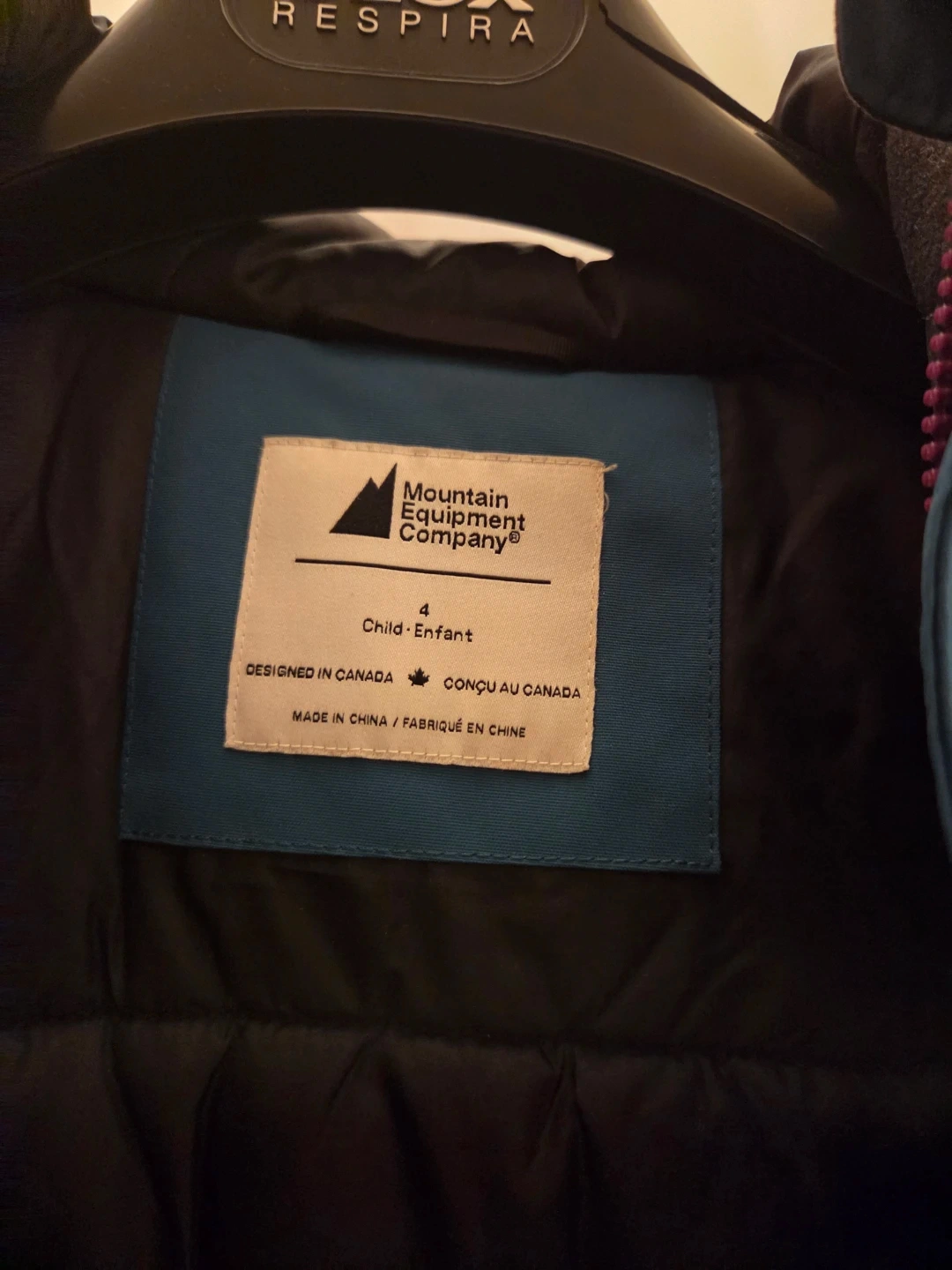 Here's a Mountain Equipment Co-op (MEC) snowsuit for a child, size 4! It's in great shape and ready for winter adventures
