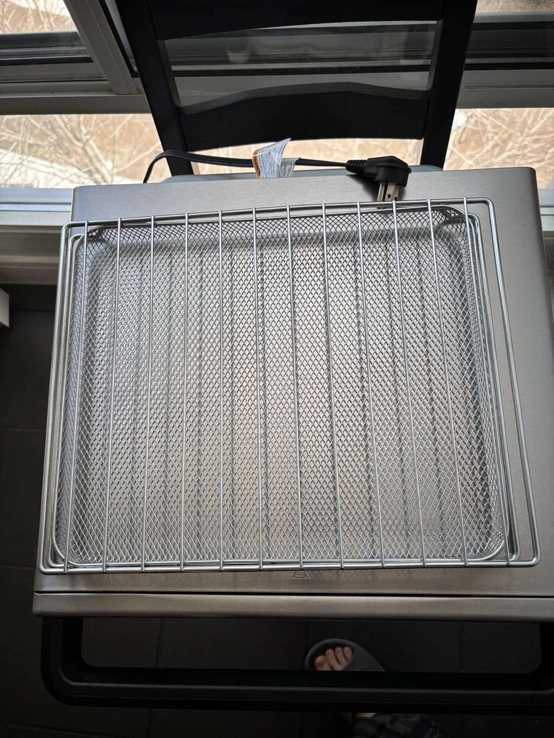 It's a Ninja brand air fryer toaster oven. Stainless steel interior and digital display. Includes wire rack and crumb tray.