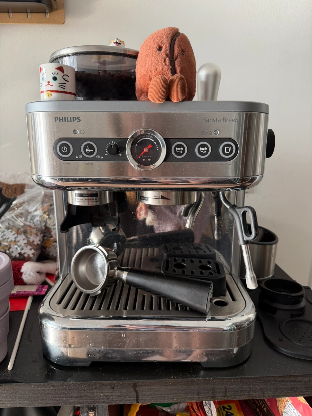 This Philips Barista Brew espresso machine comes with a portafilter, tamper, and various accessories for making your favourite coffee. It's a countertop appliance for home use. Espresso machine with various brew attachments.