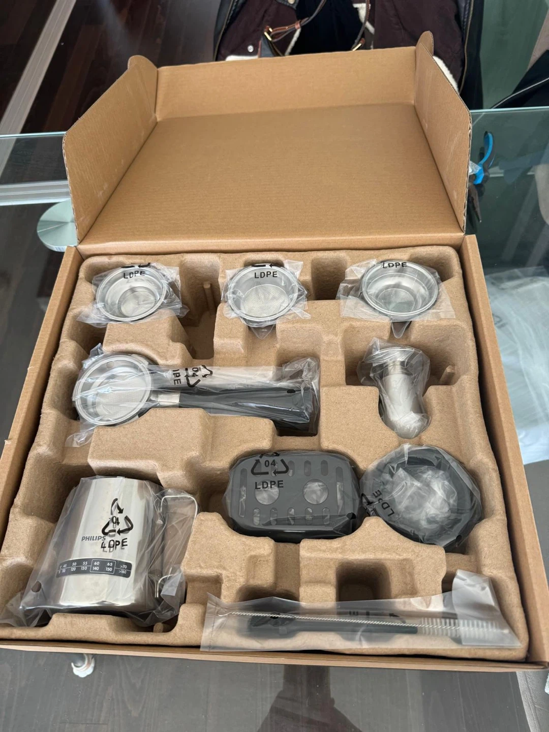 This Philips Barista Brew espresso machine comes with a portafilter, tamper, and various accessories for making your favourite coffee. It's a countertop appliance for home use. Espresso machine with various brew attachments.