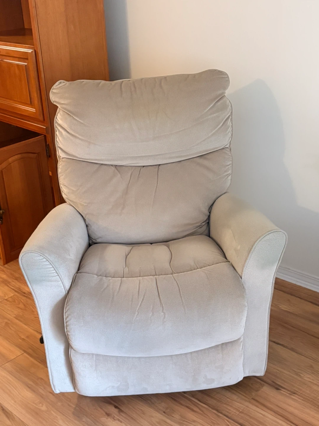 Comfortable recliner chair in a neutral light beige colour. Its soft fabric and plush cushioning make it a cozy addition to any living space. Ideal for relaxing after a long day! Must pickup no deliveries and bring manpower to move