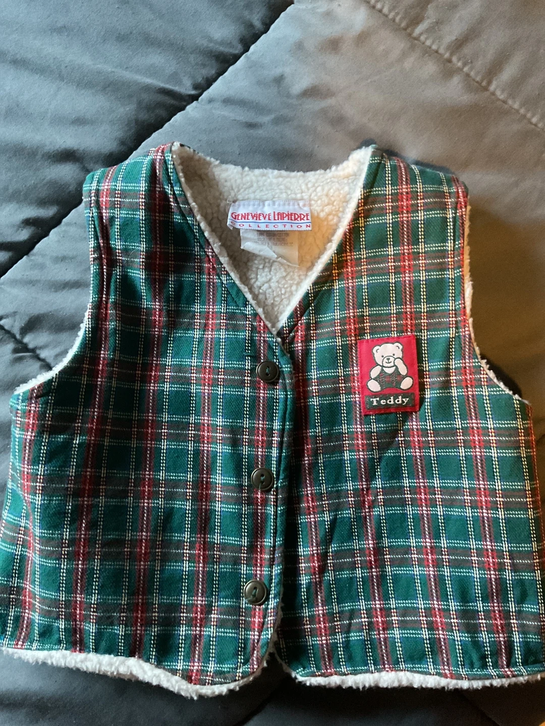 Here's a cute Genevieve Lapiere vest featuring a plaid pattern and a teddy bear patch! Size 3x (4). It's in great condition and ready for the upcoming holiday season.