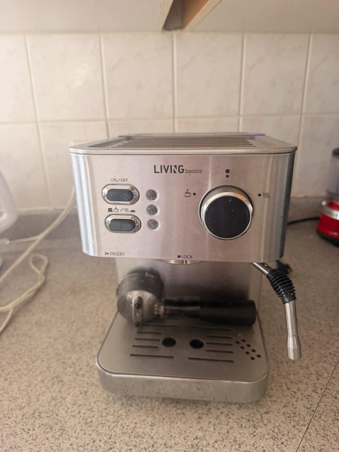 This espresso machine is from LIVING basics. It's made of stainless steel and has a compact design. It includes a portafilter and steam wand.